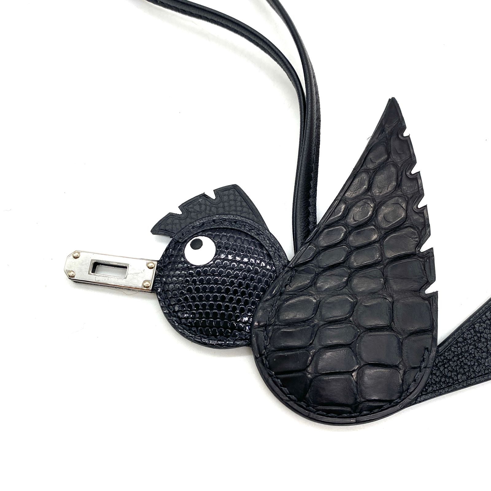 Charm Hermés Bird Lock, de piel matte Mississippiensis Alligator, Epsom,Swift, Chevre y Niloticus Lizard color negro, con herraje en Palladium. En muy buen estado.
