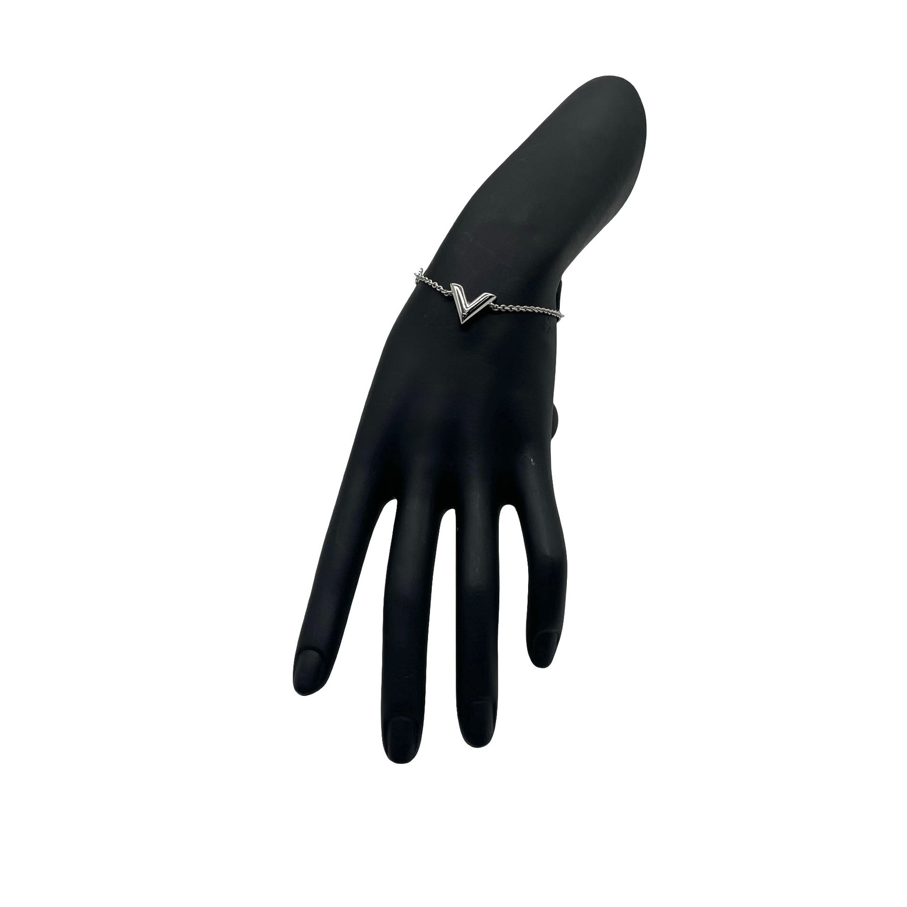 Pulsera Louis Vuitton Essential V, de metal con acabado en color plateado. Con sello LV grabado frente a la V. Con ligero desgaste en la parte trasera. Con uso, en buen estado.