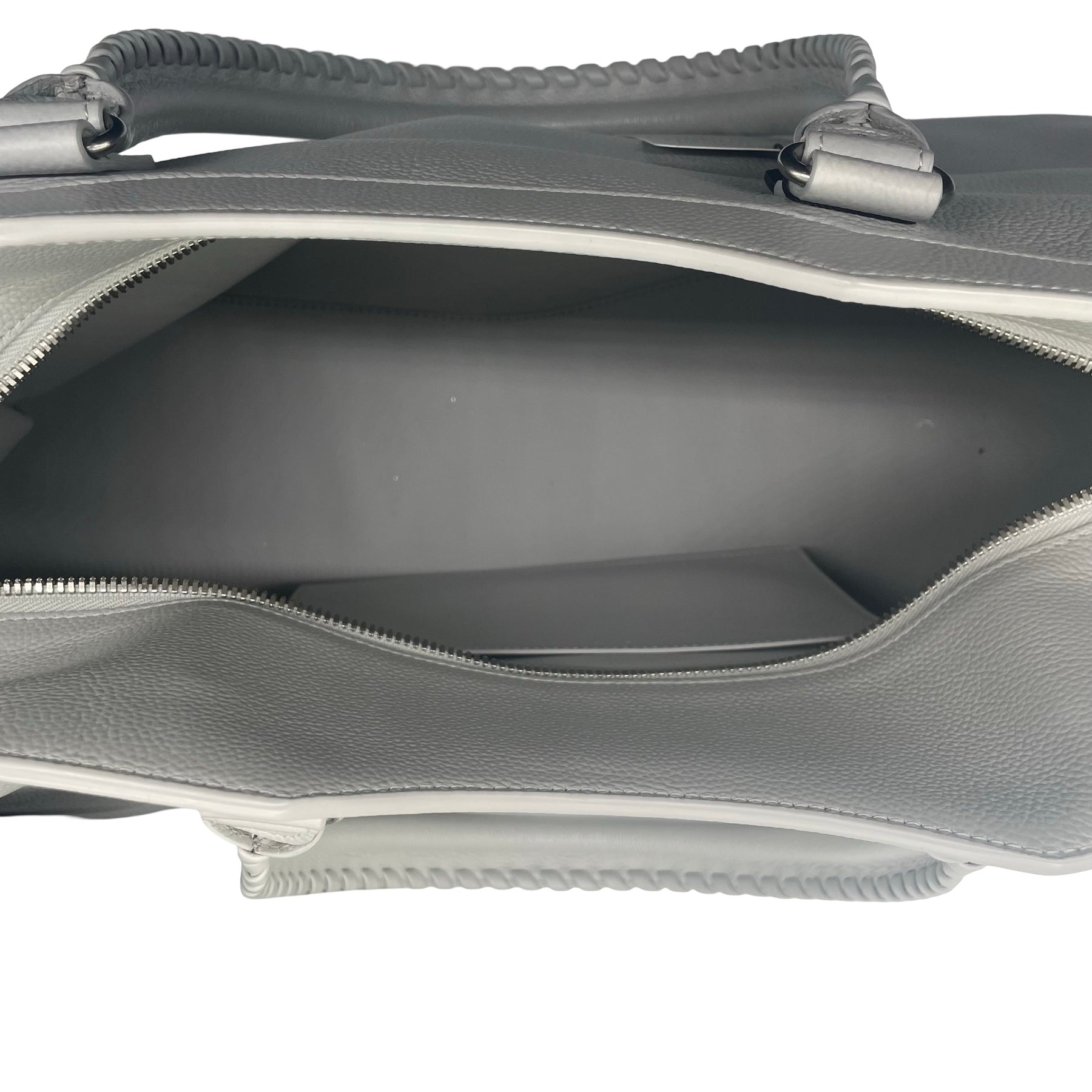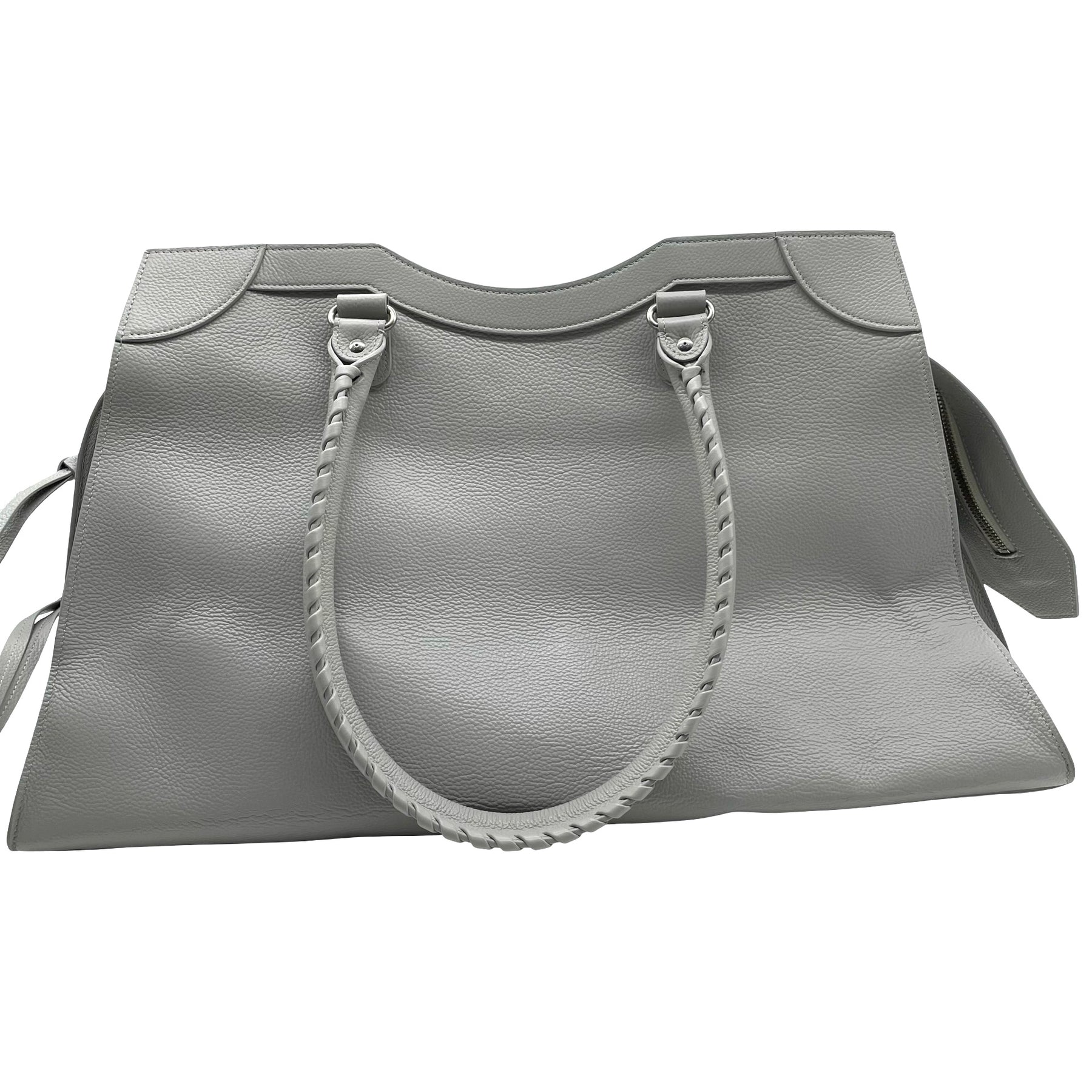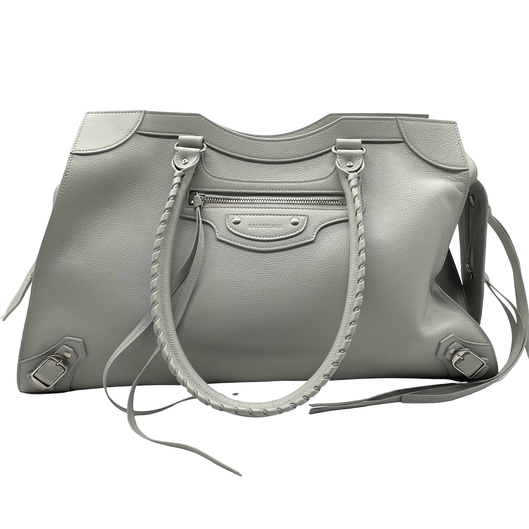 Bolsa Balenciaga Neo Classic Maxi, de piel color gris claro, con cierre enfrente y dos asas de mano. Con uso, en buen estado.