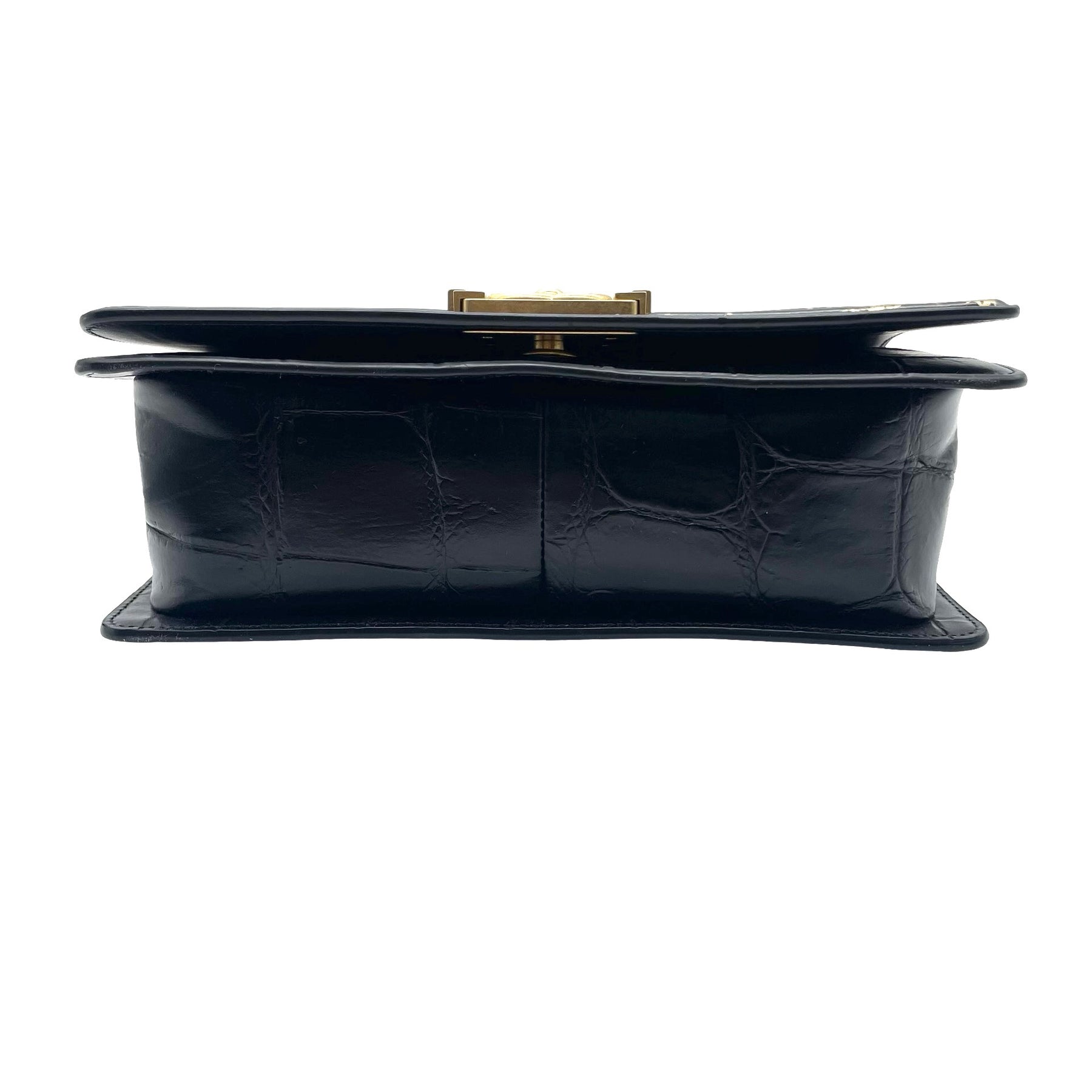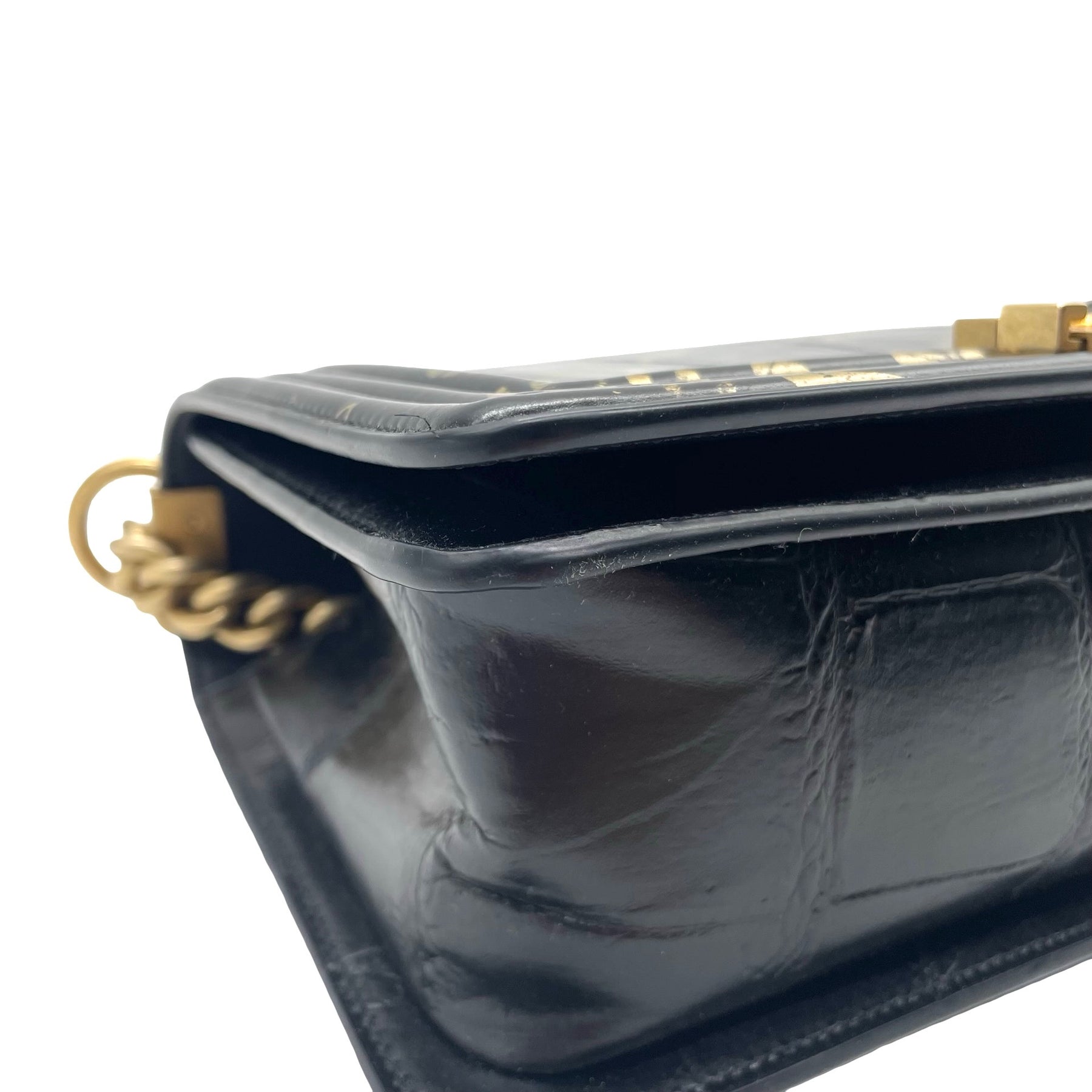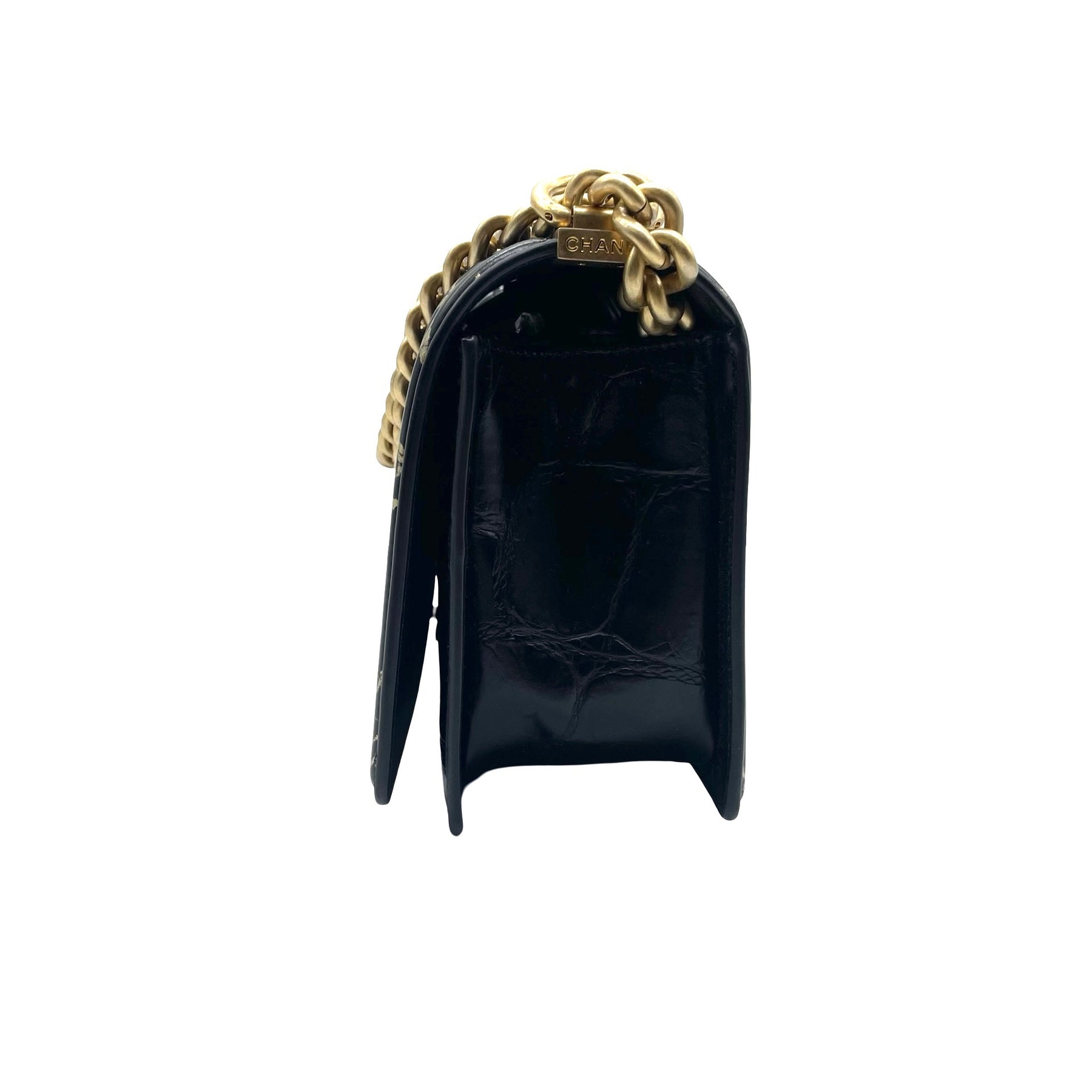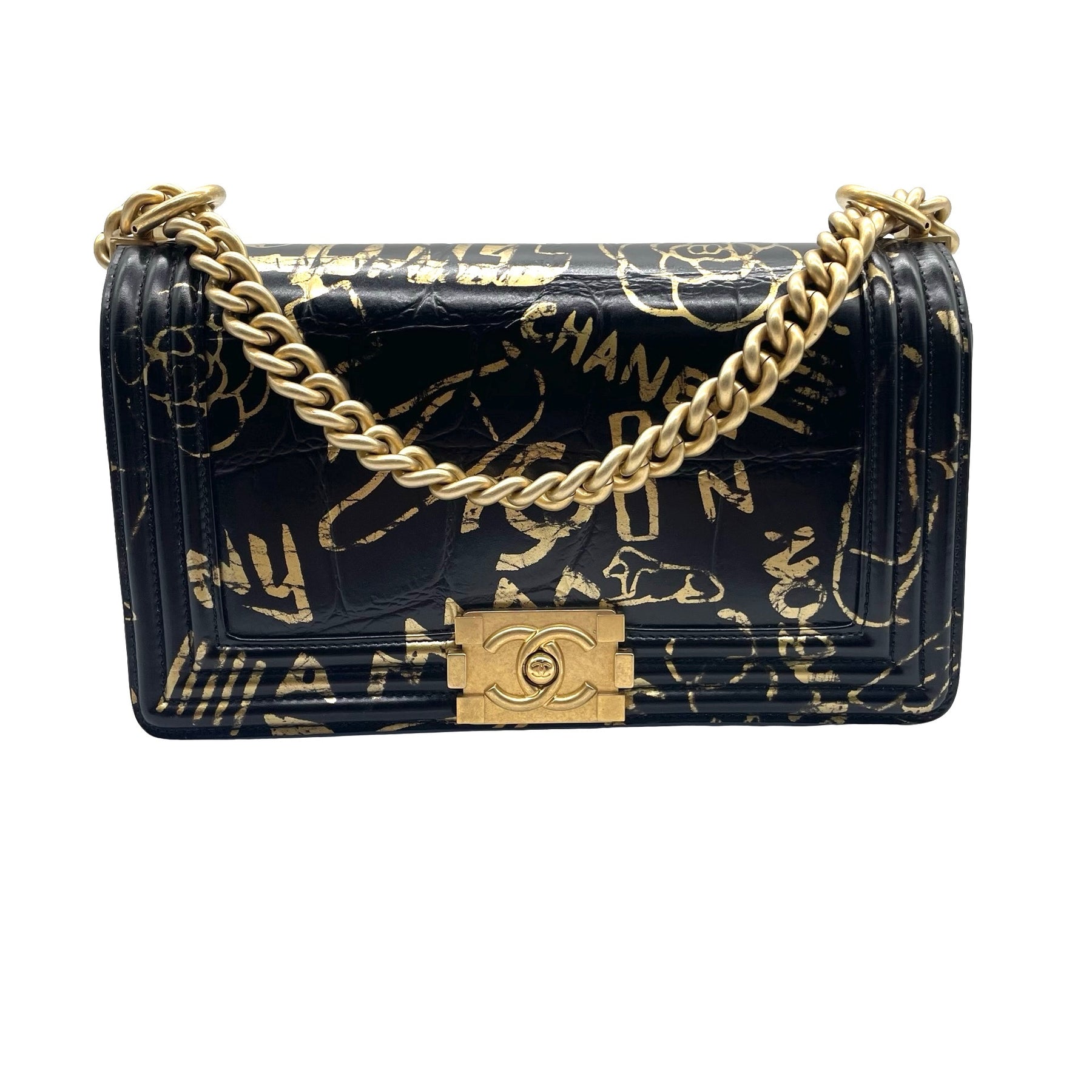 Bolsa Chanel Boy, Single Flap, de piel tipo cocodrilo color negro, print de graffiti en color dorado, herrajes dorado y cadena al hombro. Con ligero desgaste en esquinas. Con uso, en buen estado.