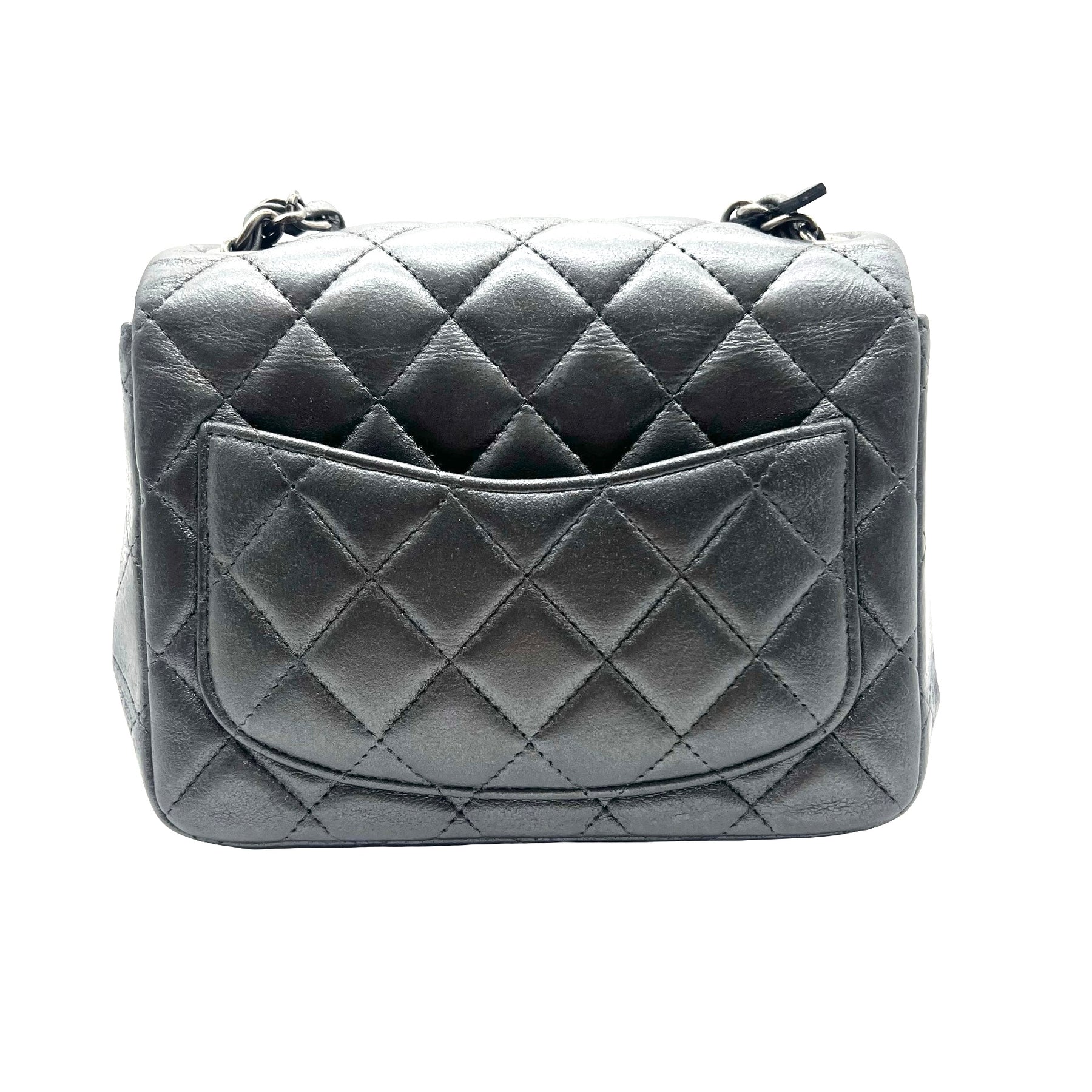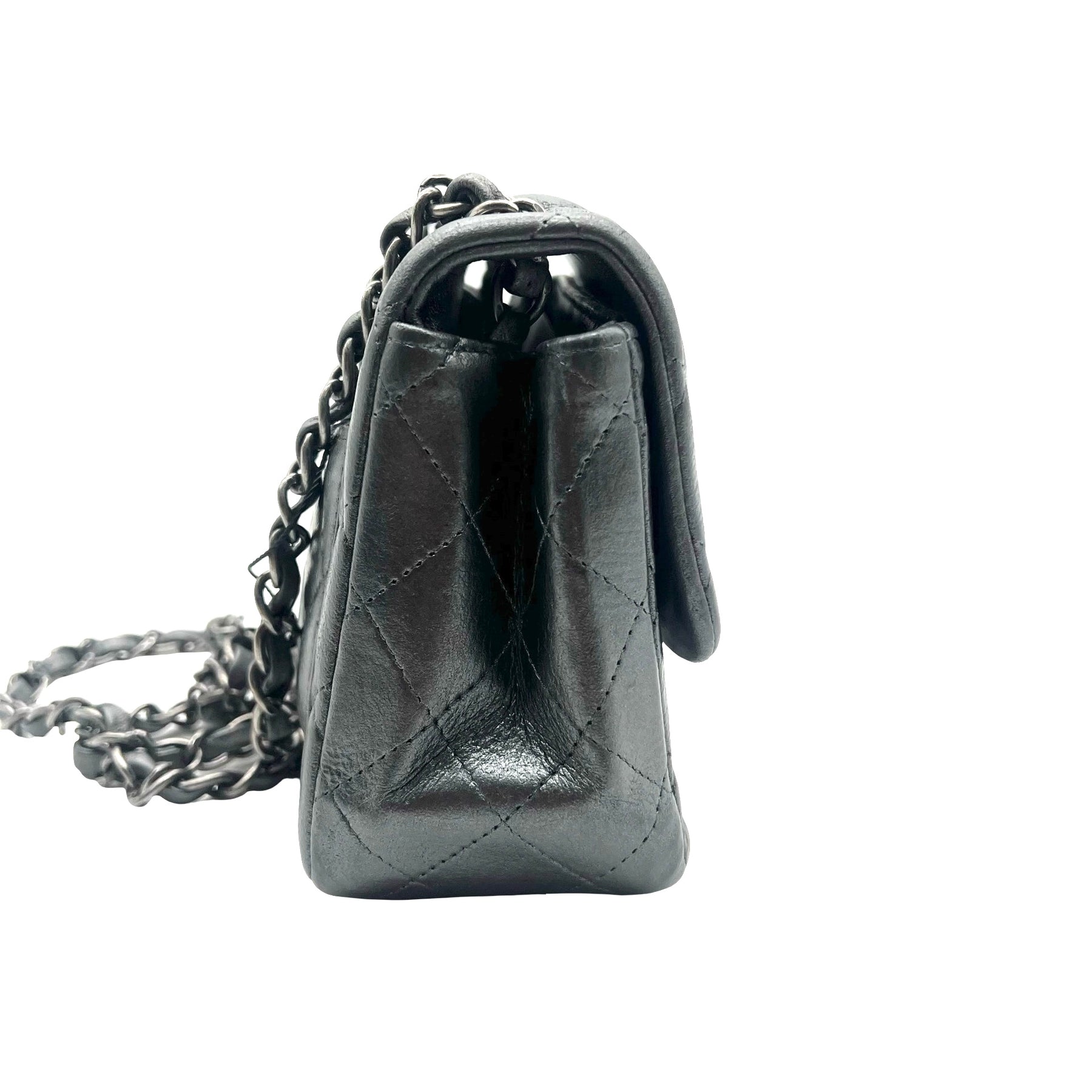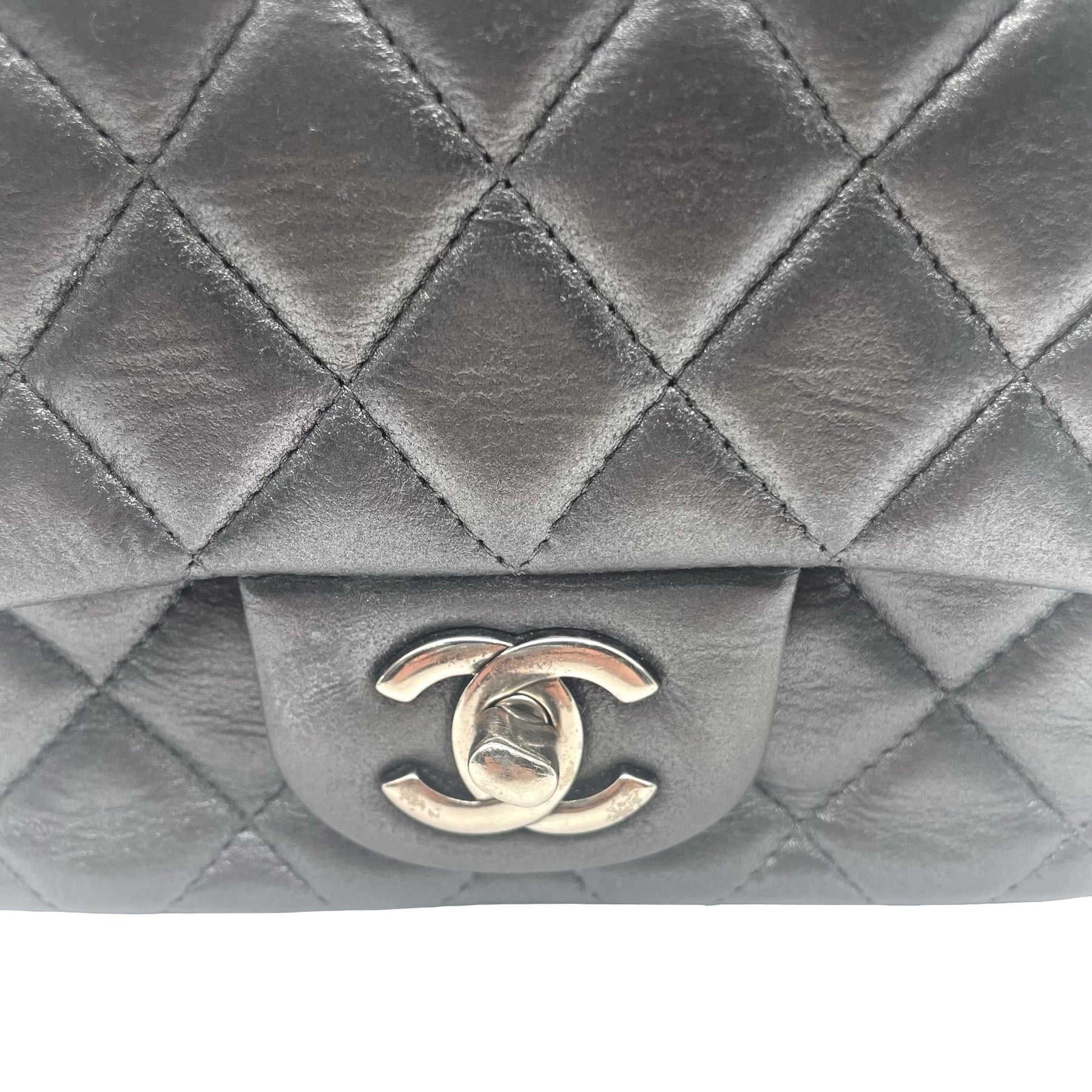 Bolsa Chanel Clásica Mini, en piel terminado Lambskin color gris metálico, con herrajes en plateado y cadena al hombro. Con uso, en buen estado.
