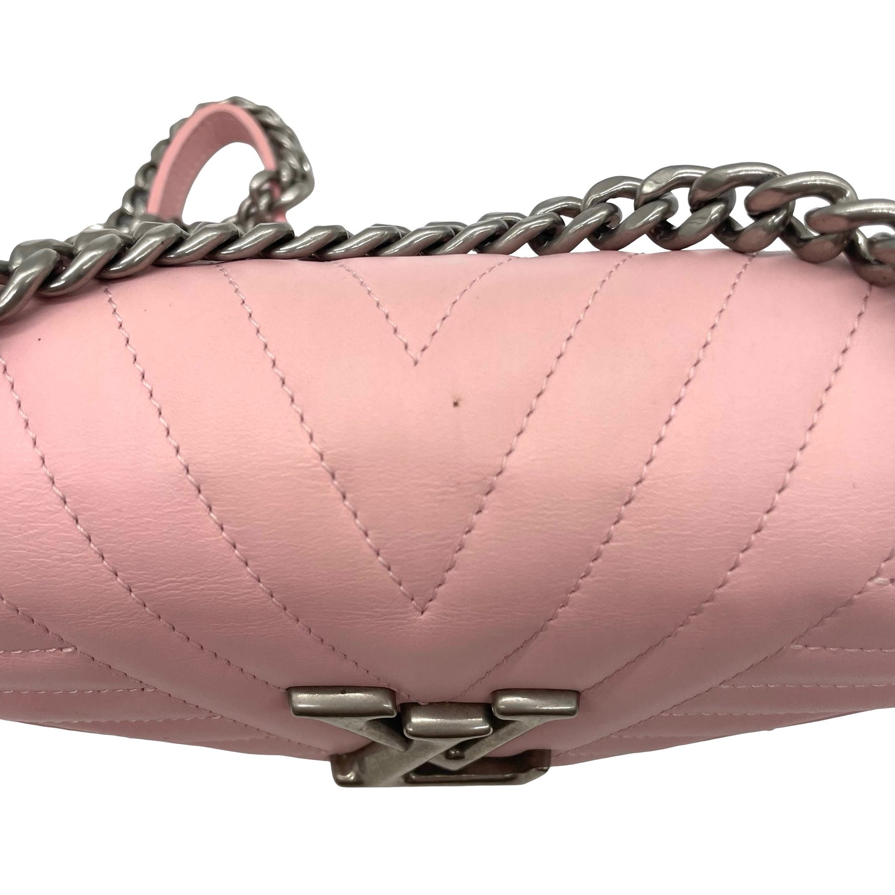 Bolsa Louis Vuitton New Wave Chain PM, de piel color rosa, asa de mano con logo grabado multicolor, cadena al hombro y herrajes en plateado. Con desgaste en piel por herrajes, desgaste de piel en orillas y pequeñas manchas.