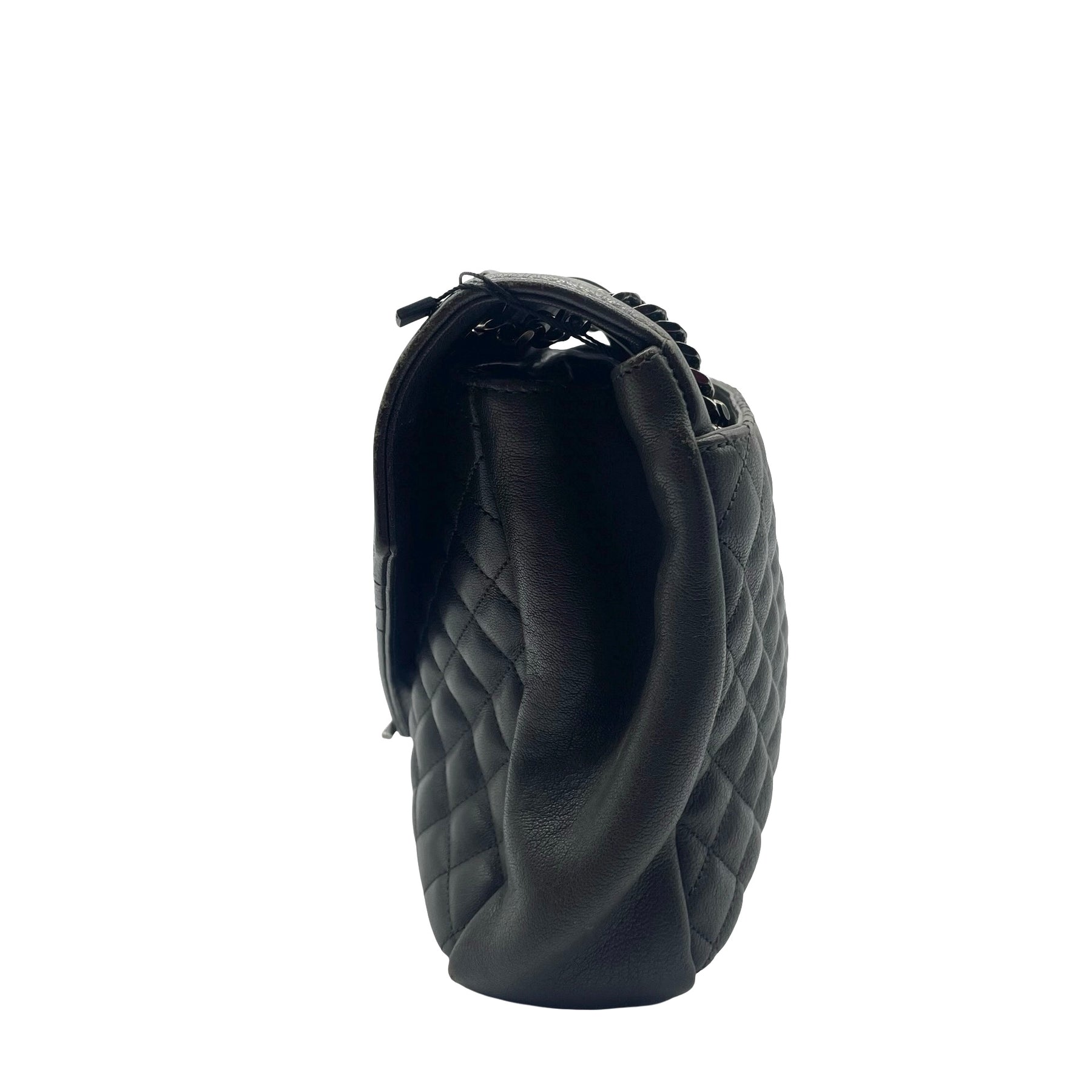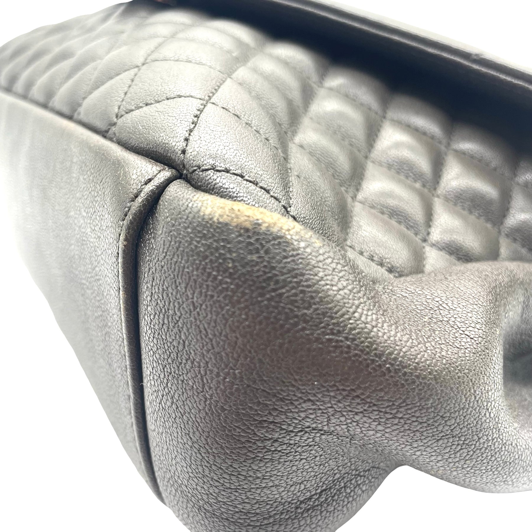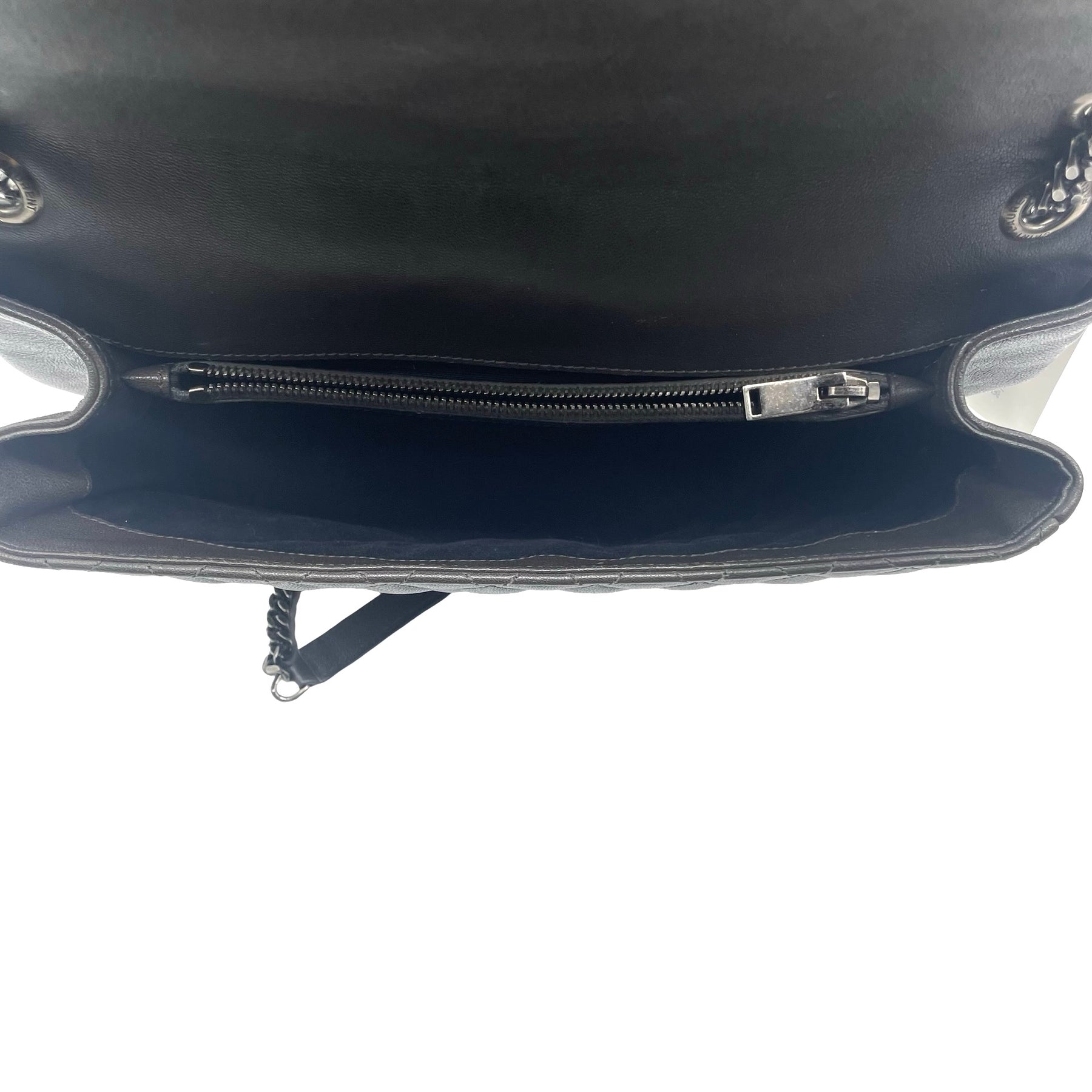 Bolsa Saint Laurent College, grande en piel color gris oscuro, con correa de eslabones plateada, placa con iniciales YSL en plateado. Con desgaste en esquinas, en buen estado.