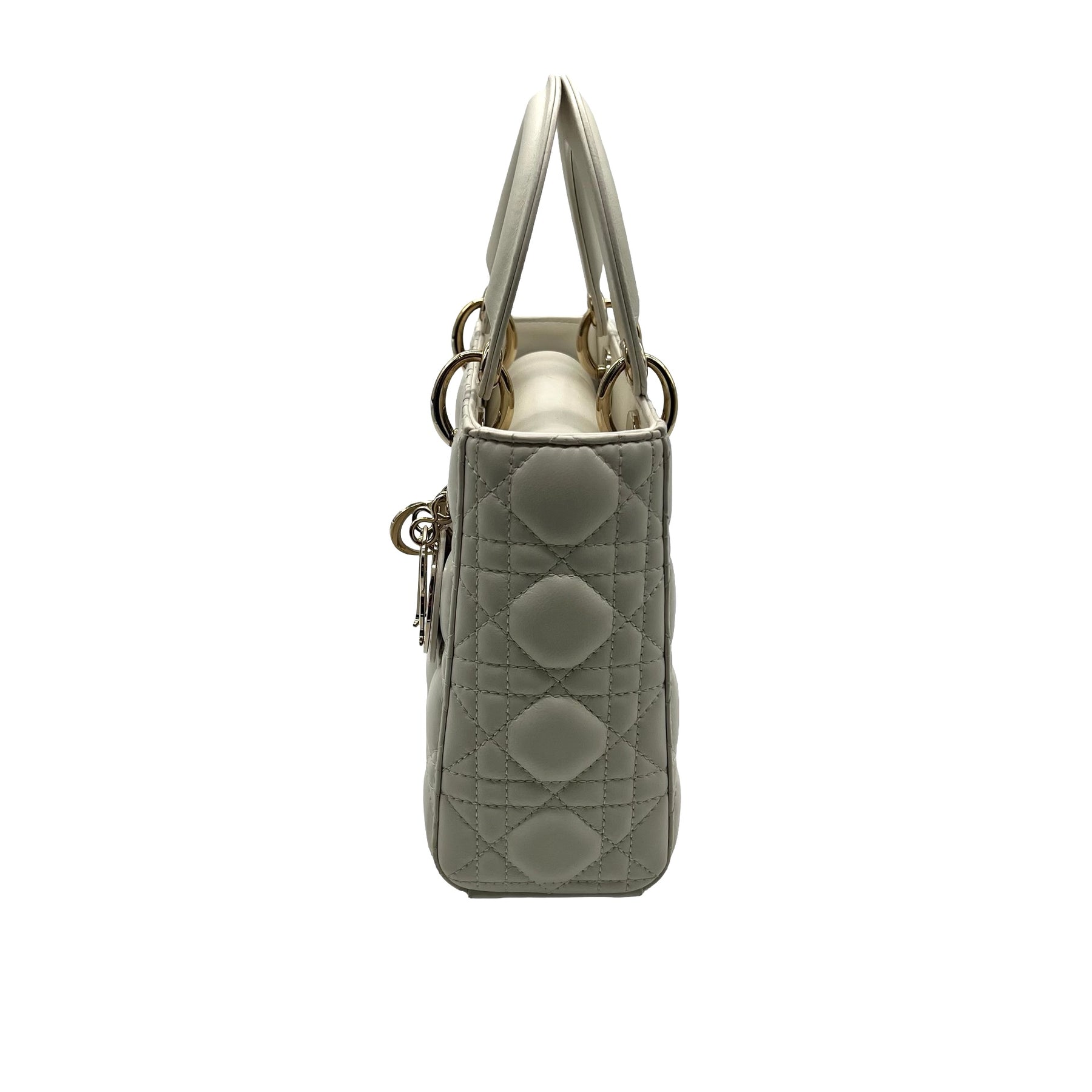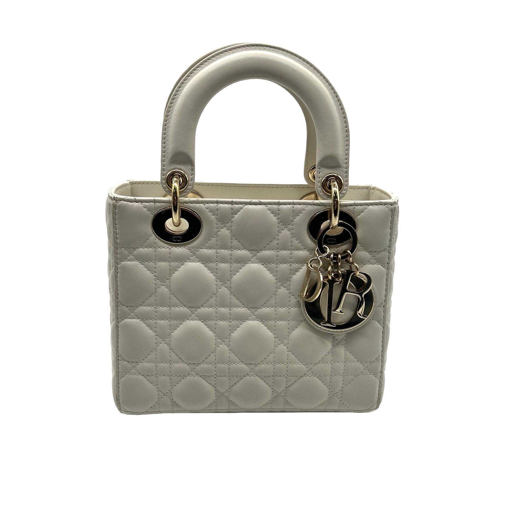 Bolsa Lady Dior Pequeña, en piel color blanco, con dos asas de mano, strap removible y ajustable con charms y herrajes en dorado. Con desgaste en esquinas, en buen estado.