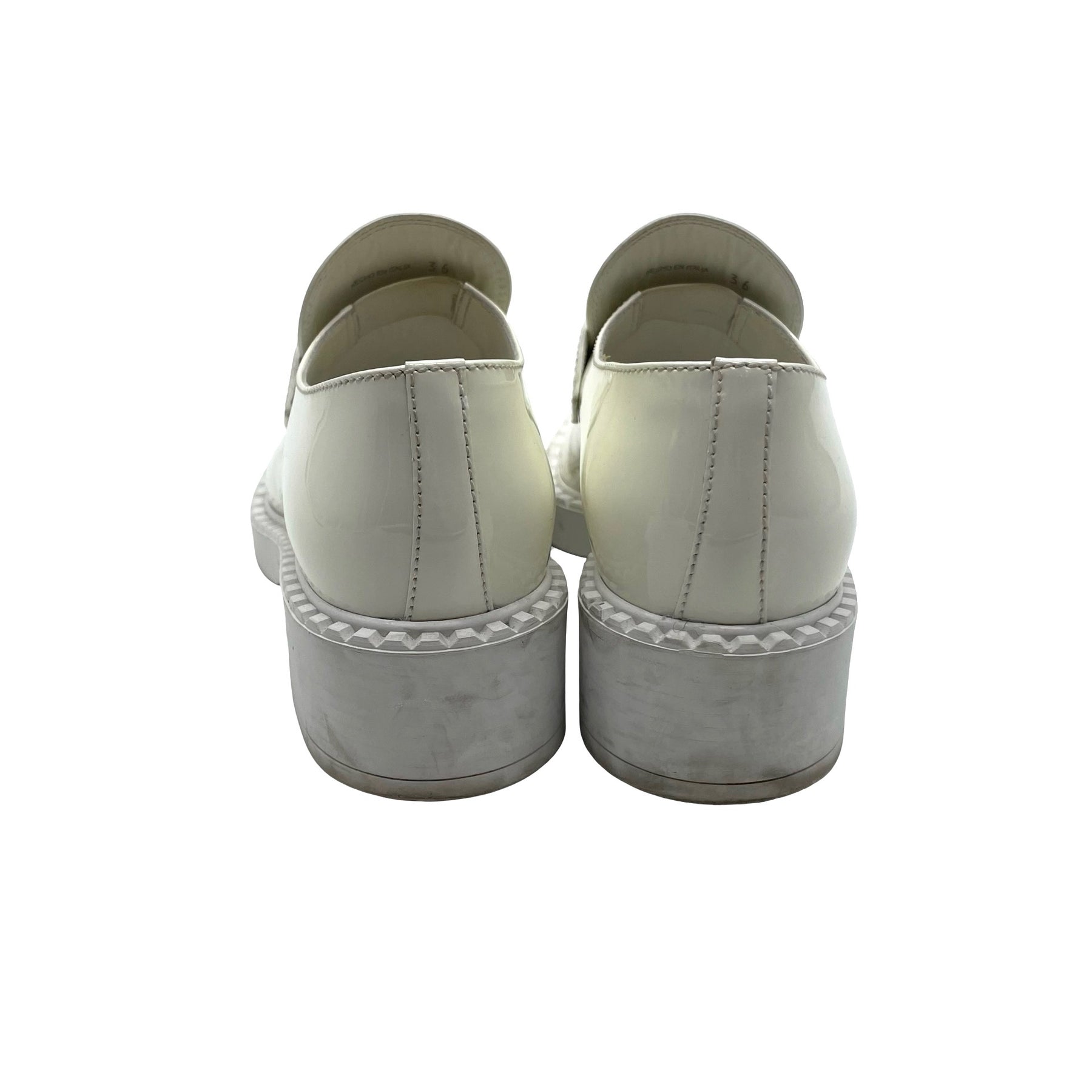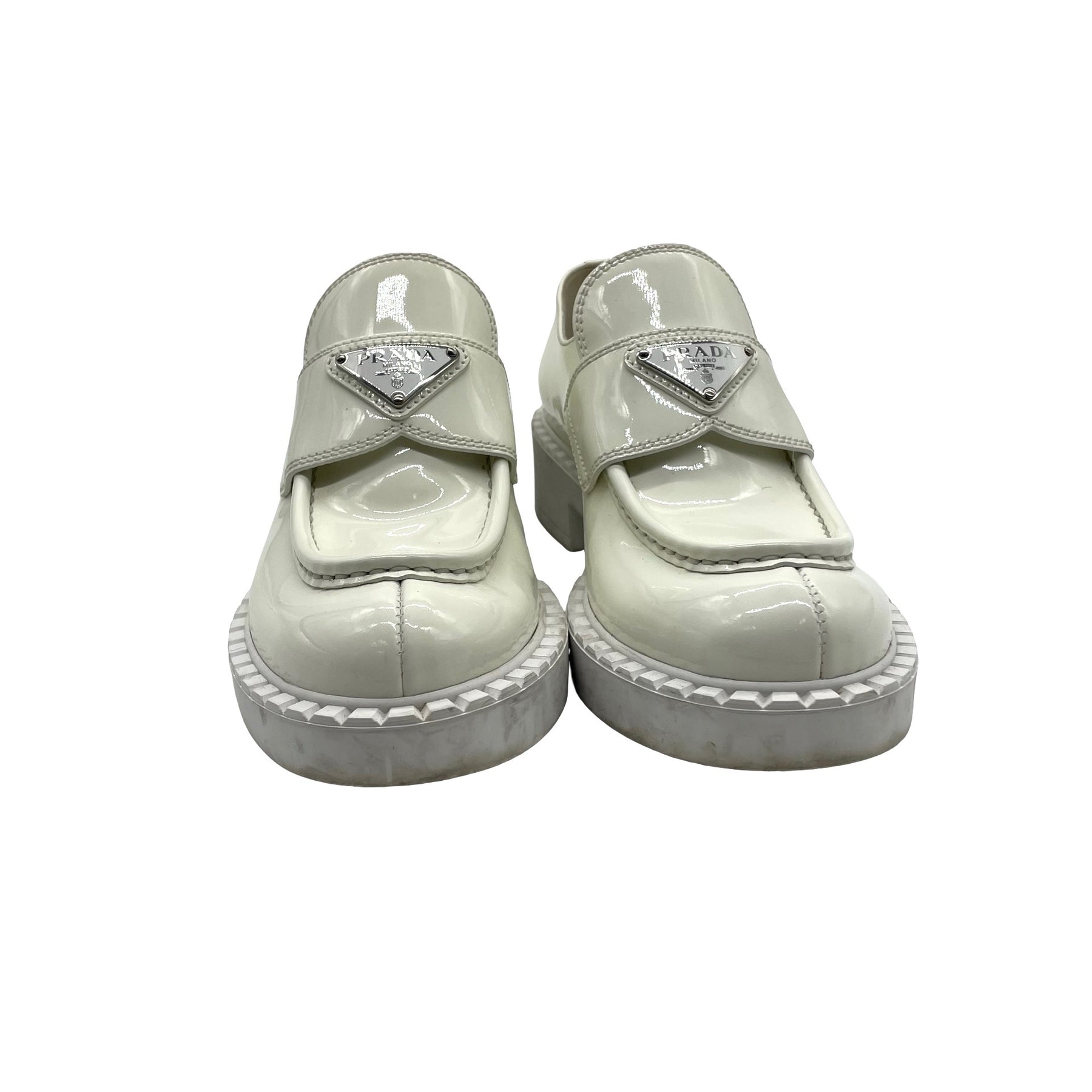 Mocasines Prada, de piel color blanco en terminación de charol con placa de logo enfrente y plataforma. Con desgaste de uso.