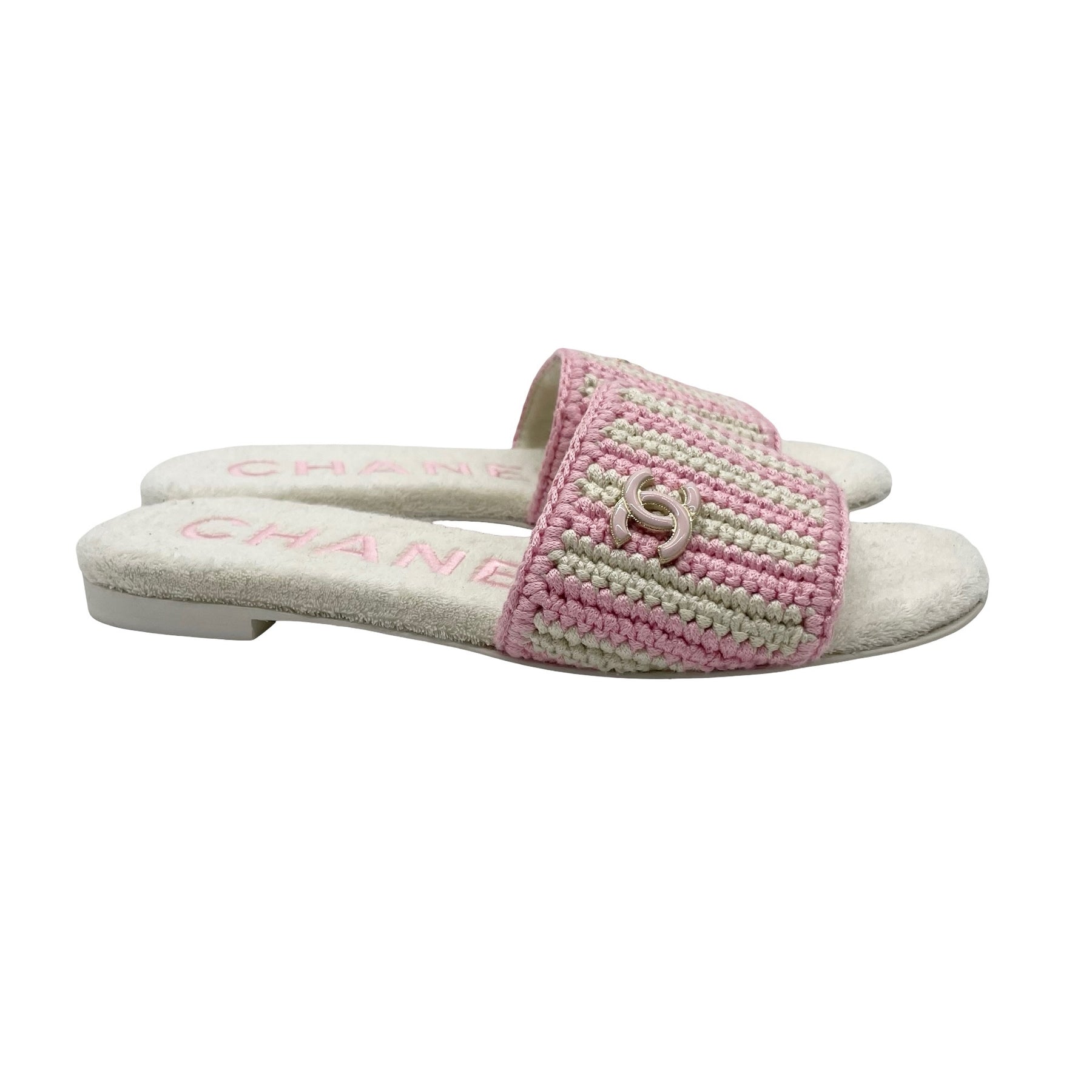 Sandalias Chanel, de piel con suela de felpa color blanco con strap de crochet blanco y rosa con placa de logotipo y camelia. Con uso, en buen estado.