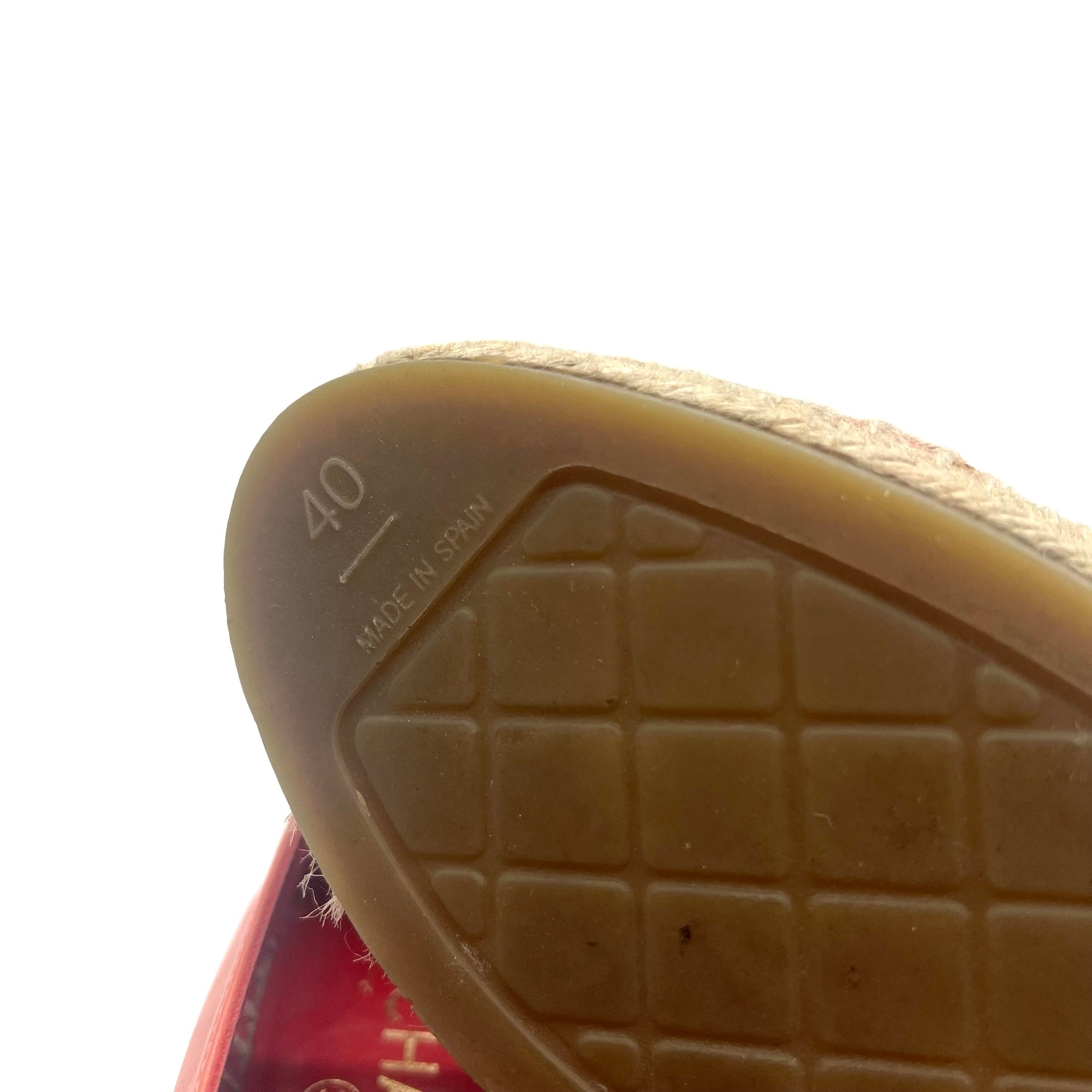 Alpargatas Chanel, de piel y yute color coral, con CC en frente rosa oscuro y negro en la punta. Con uso, en buen estado.