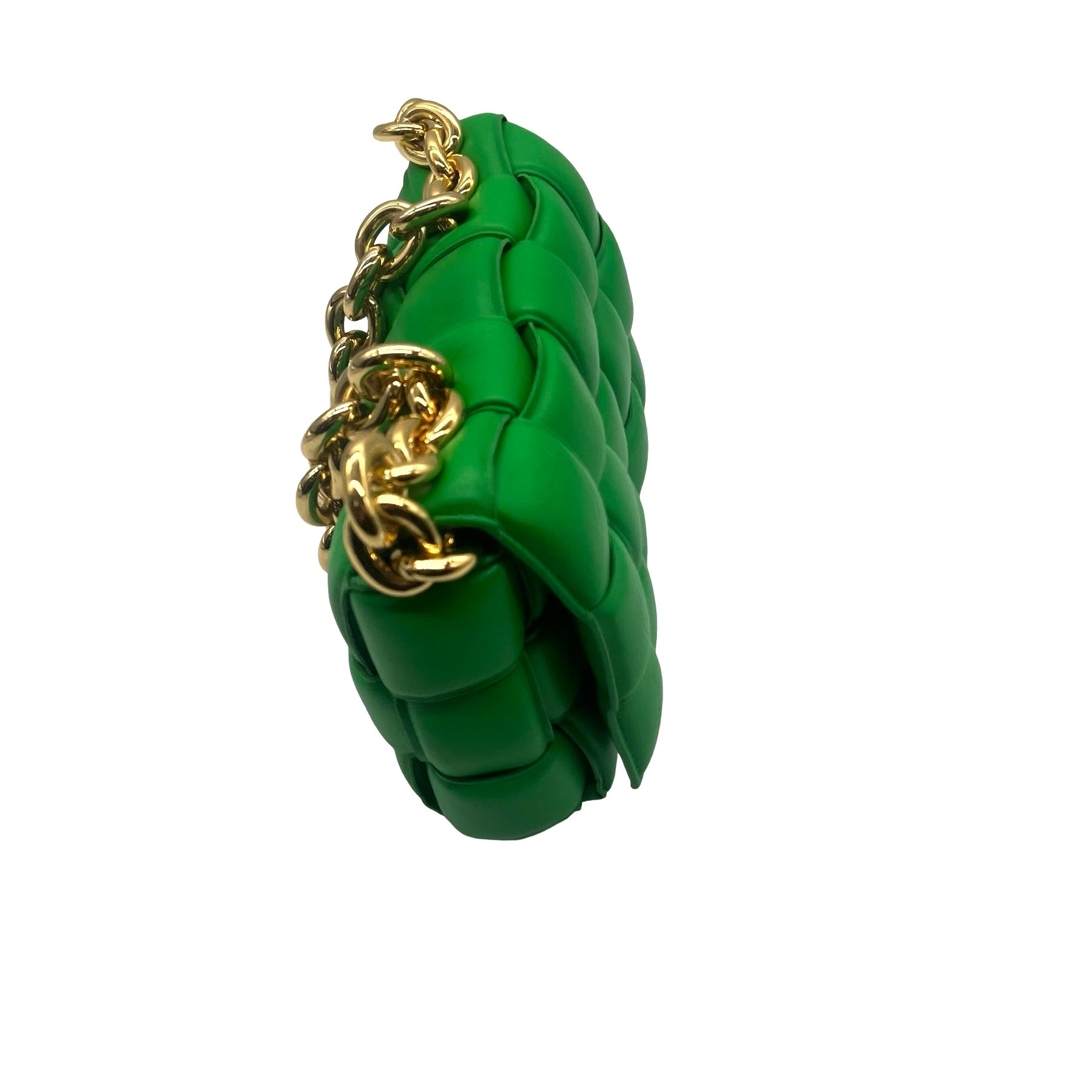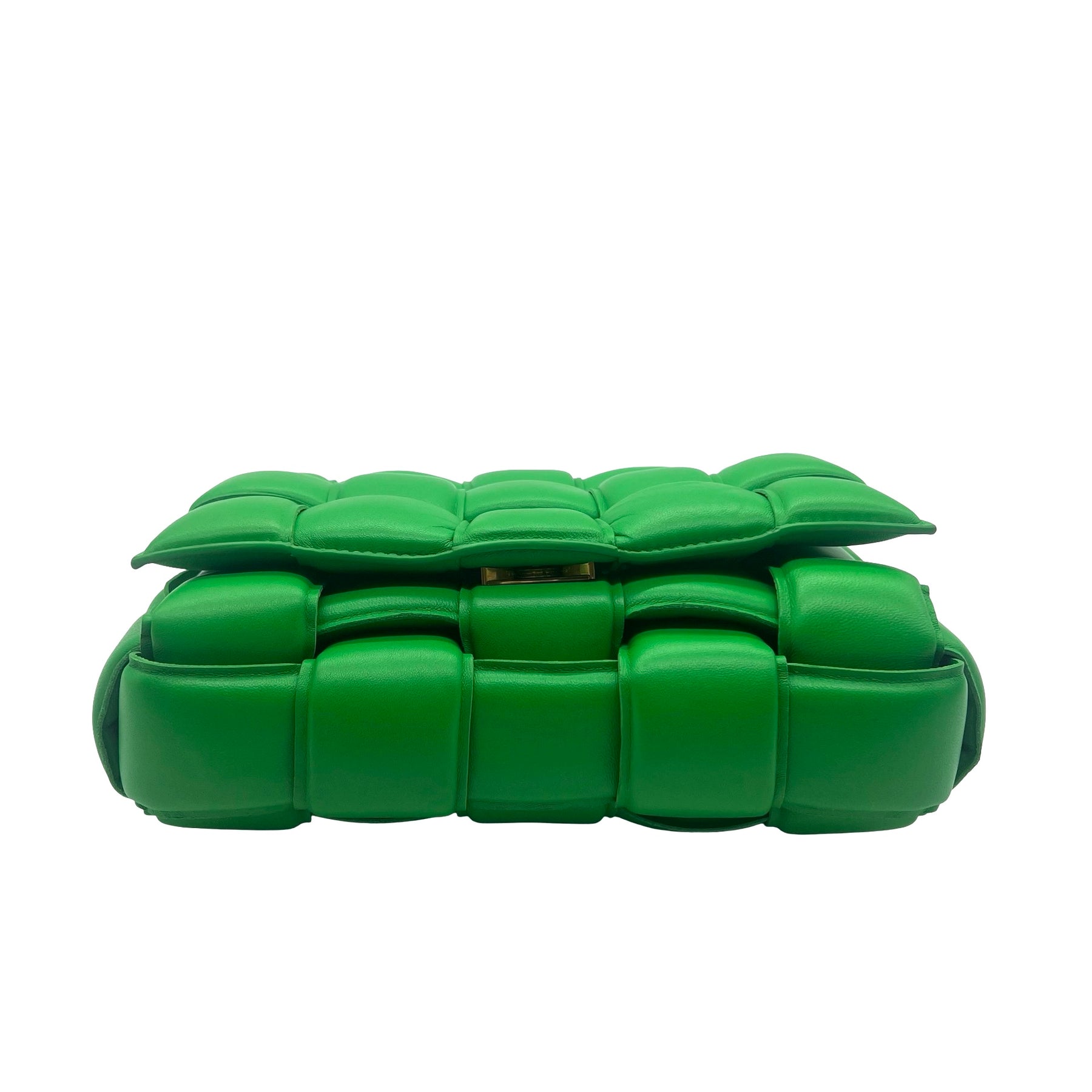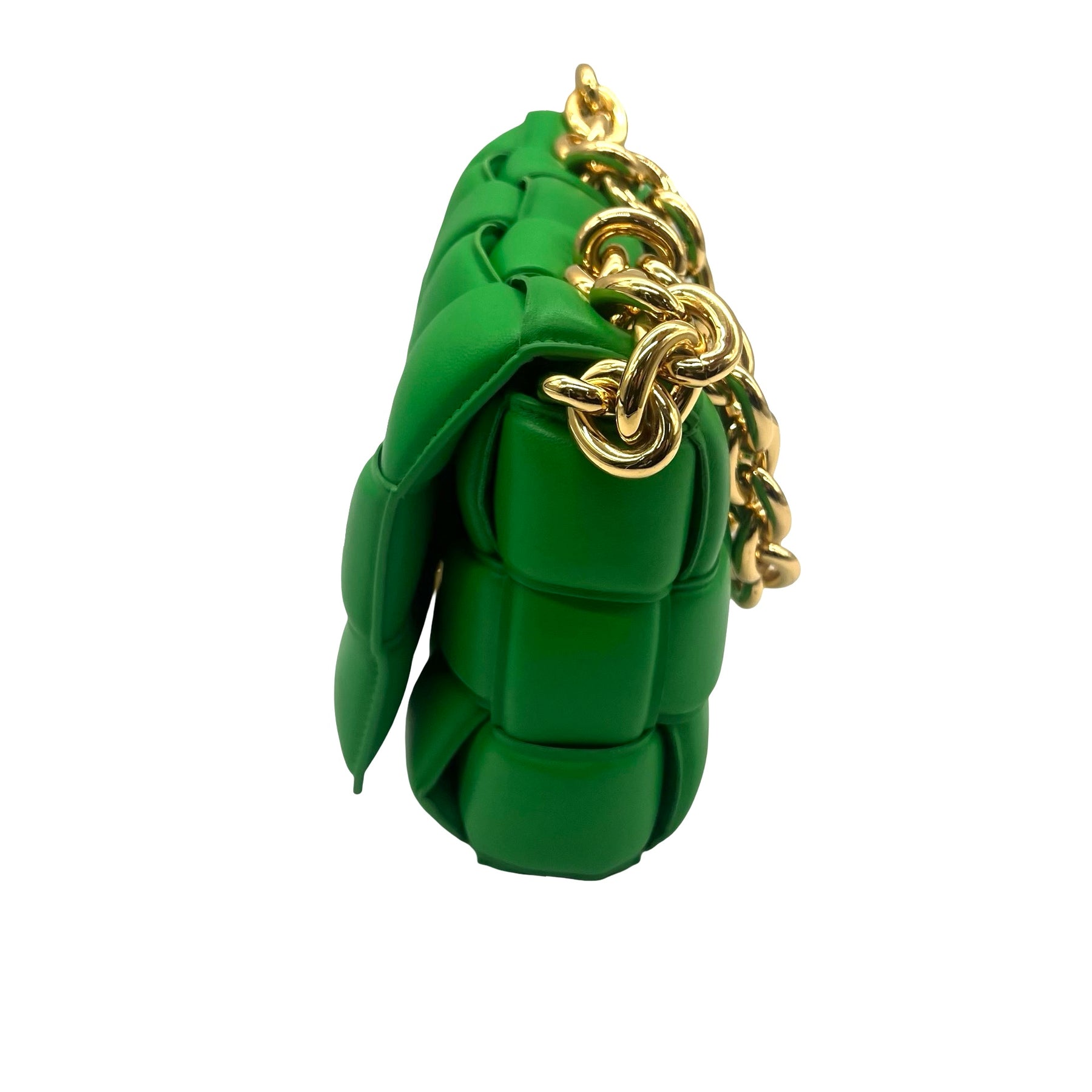 Bolsa Bottega Veneta Chain Cassette, de piel acolchonada color verde, con cadena al hombro y herrajes en dorado. Con uso, en  excelente estado.