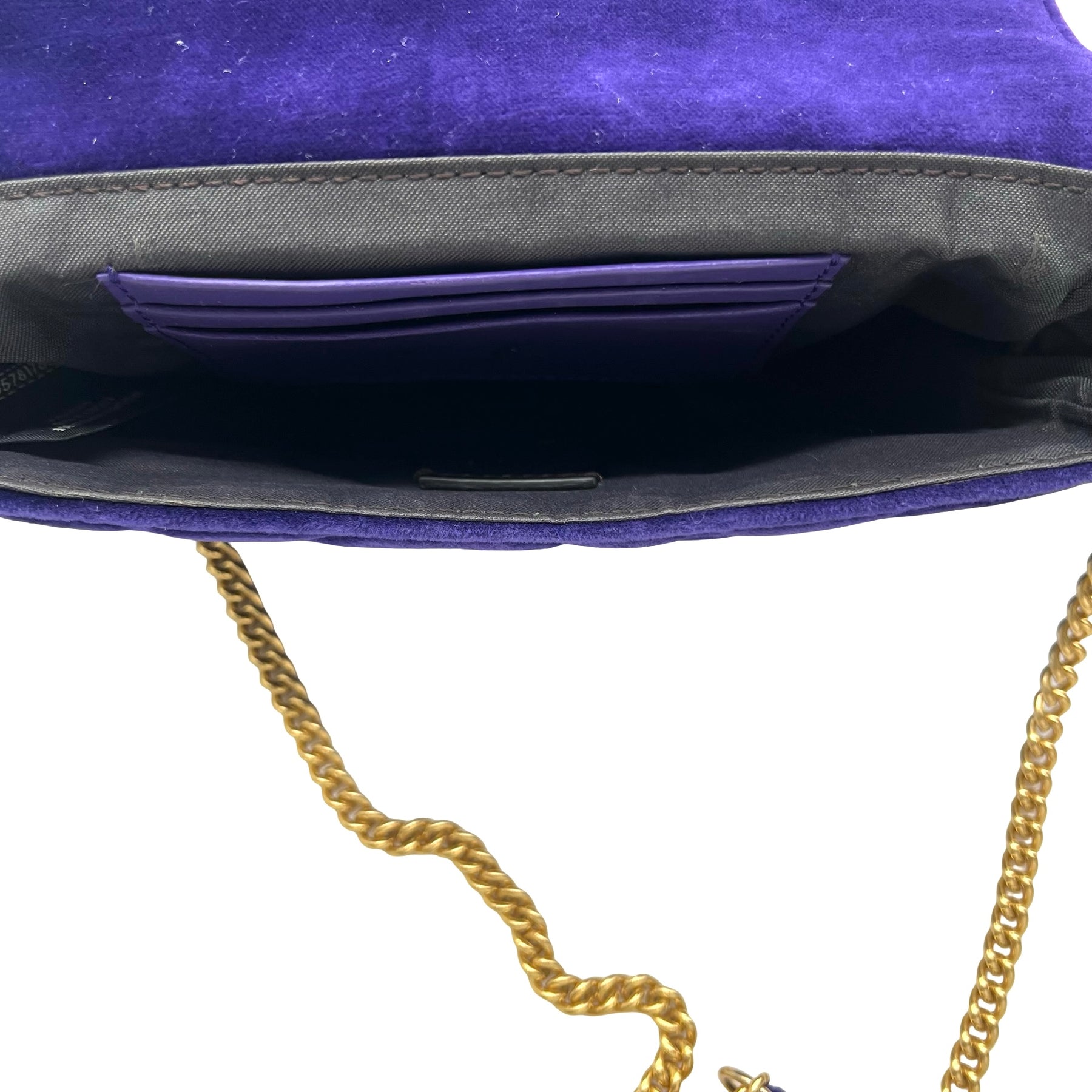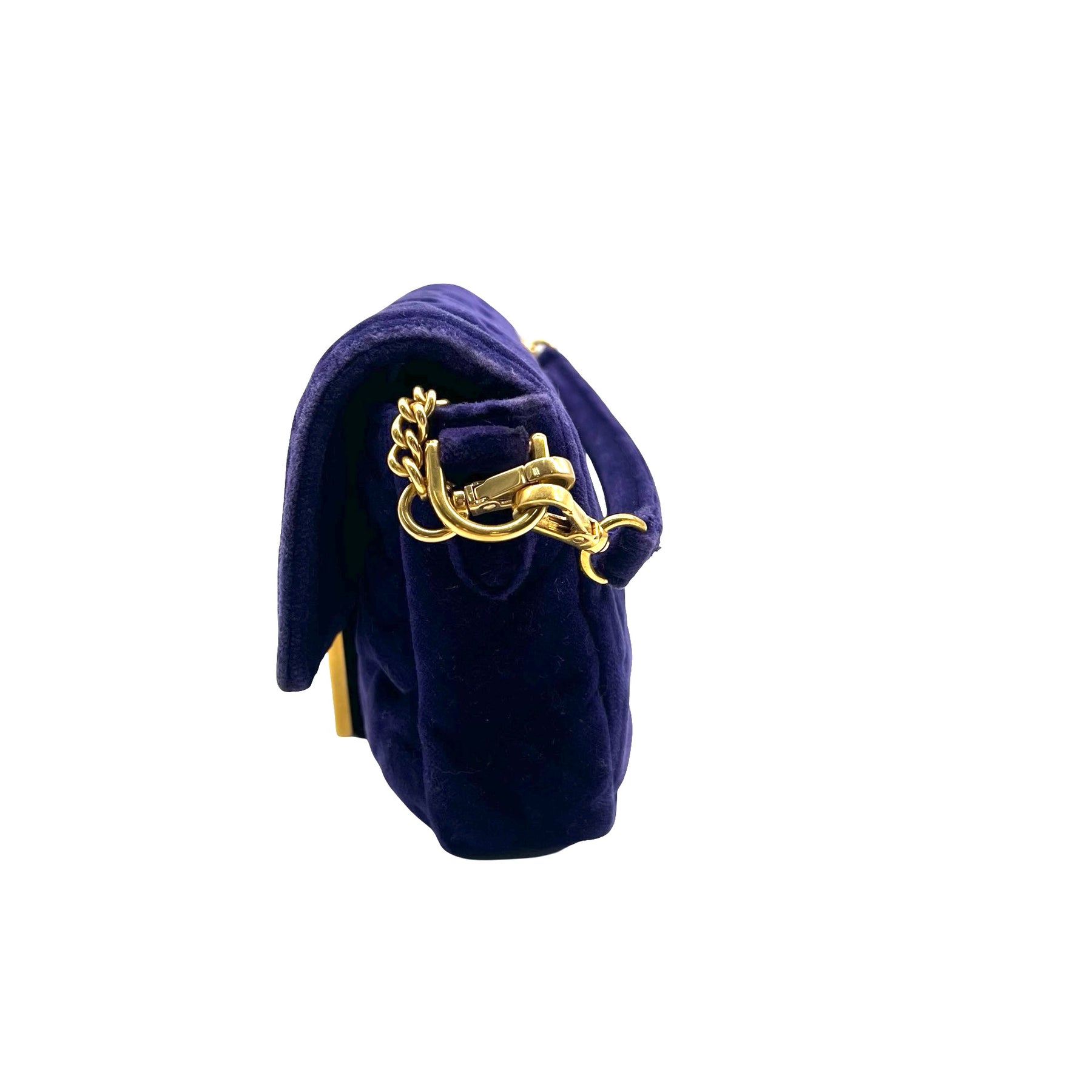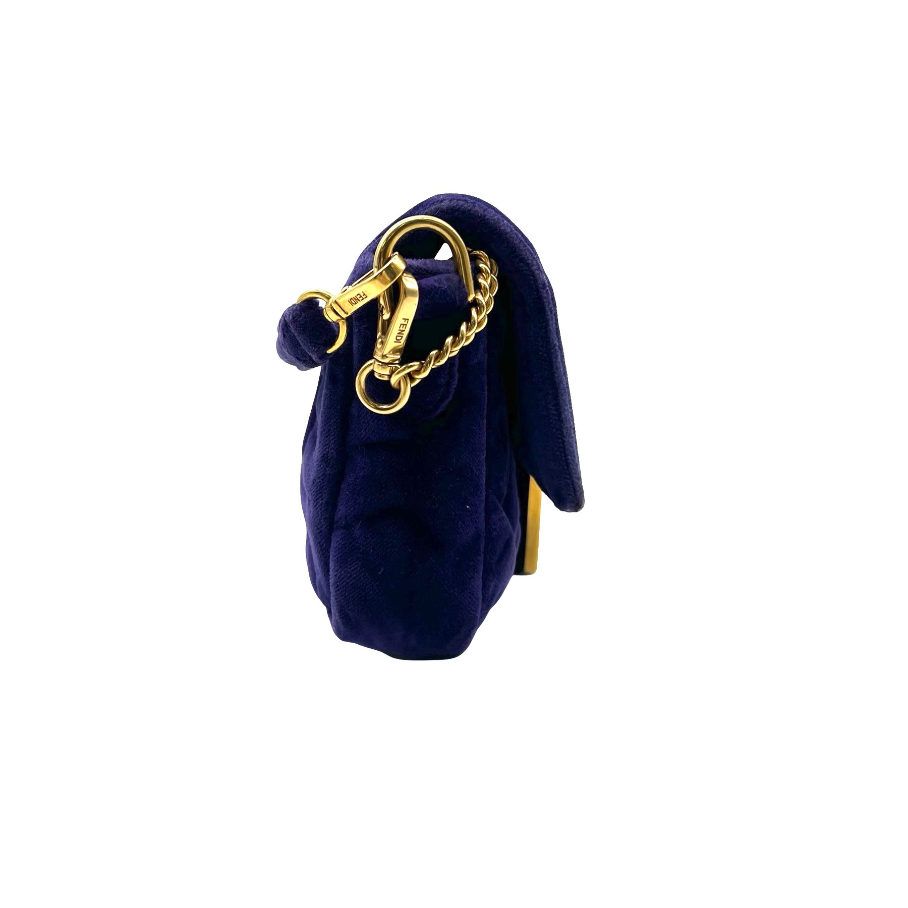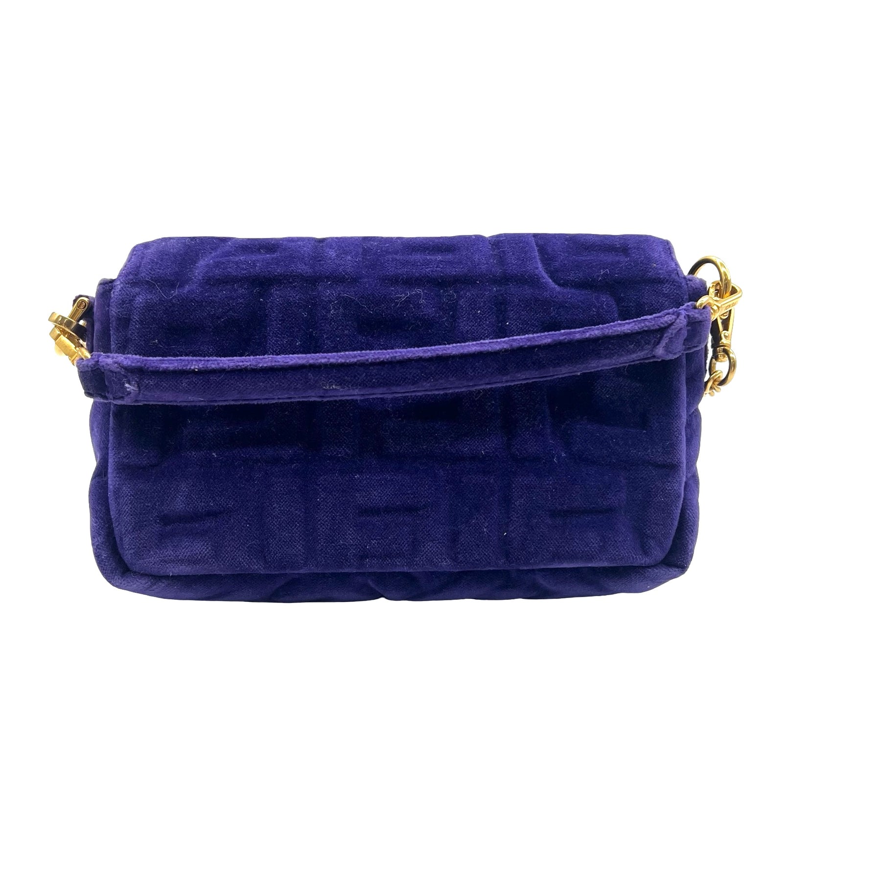 Bolsa Fendi Baguette Mini, de velvet color violeta, herrajes en dorado y print FF. Con uso, en buen estado.