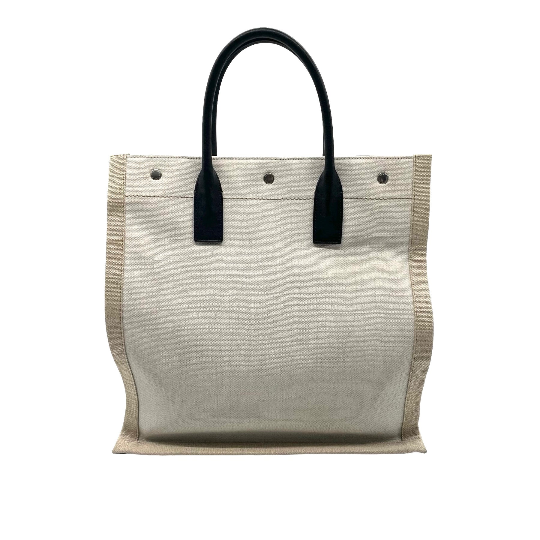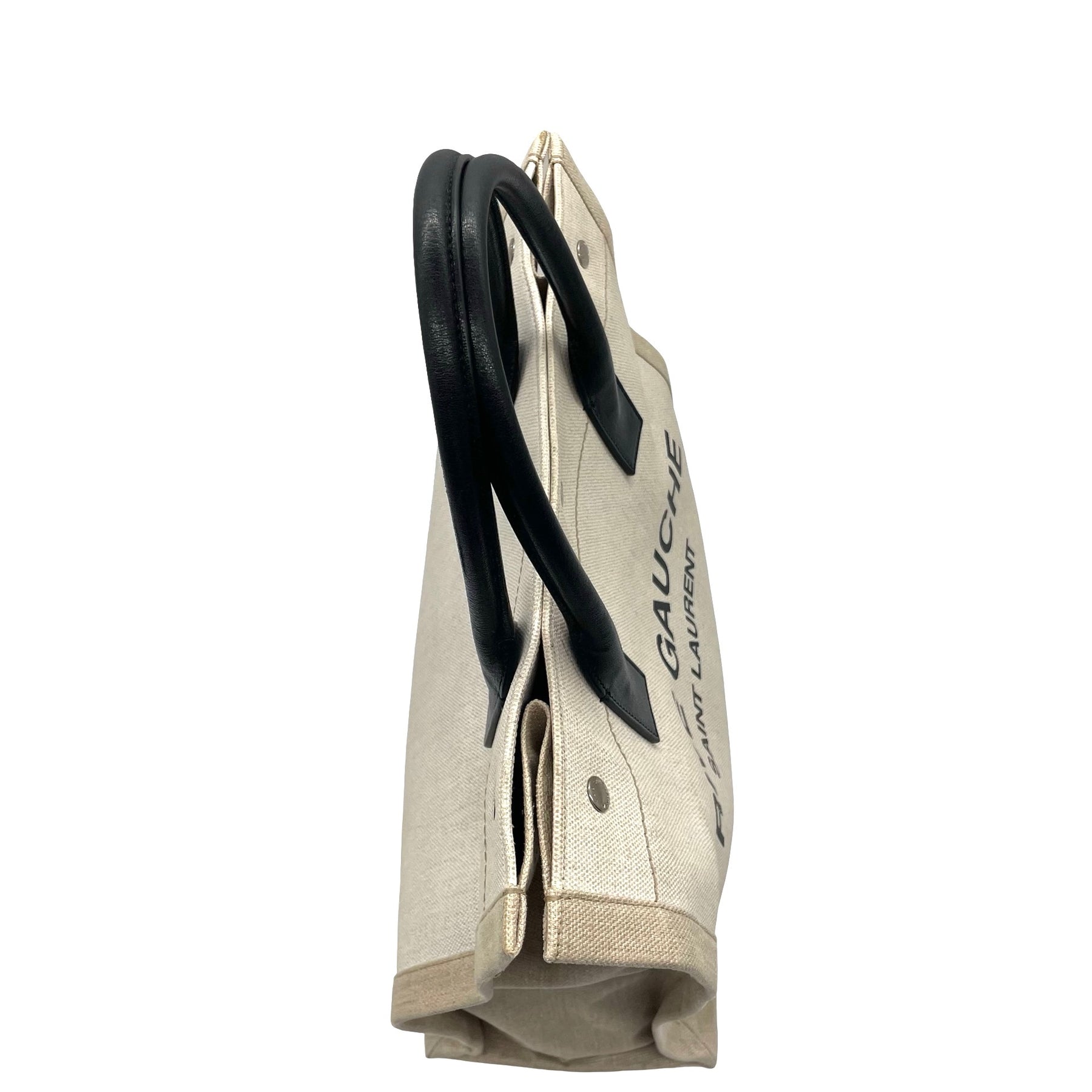 Bolsa Saint Laurent Rive Gauche North/South, de canvas color beige con print de logo enfrente, dos asas al hombro de piel en color negro y herrajes en plateado. Con ligero desgaste en esquinas. Con uso, en buen estado.