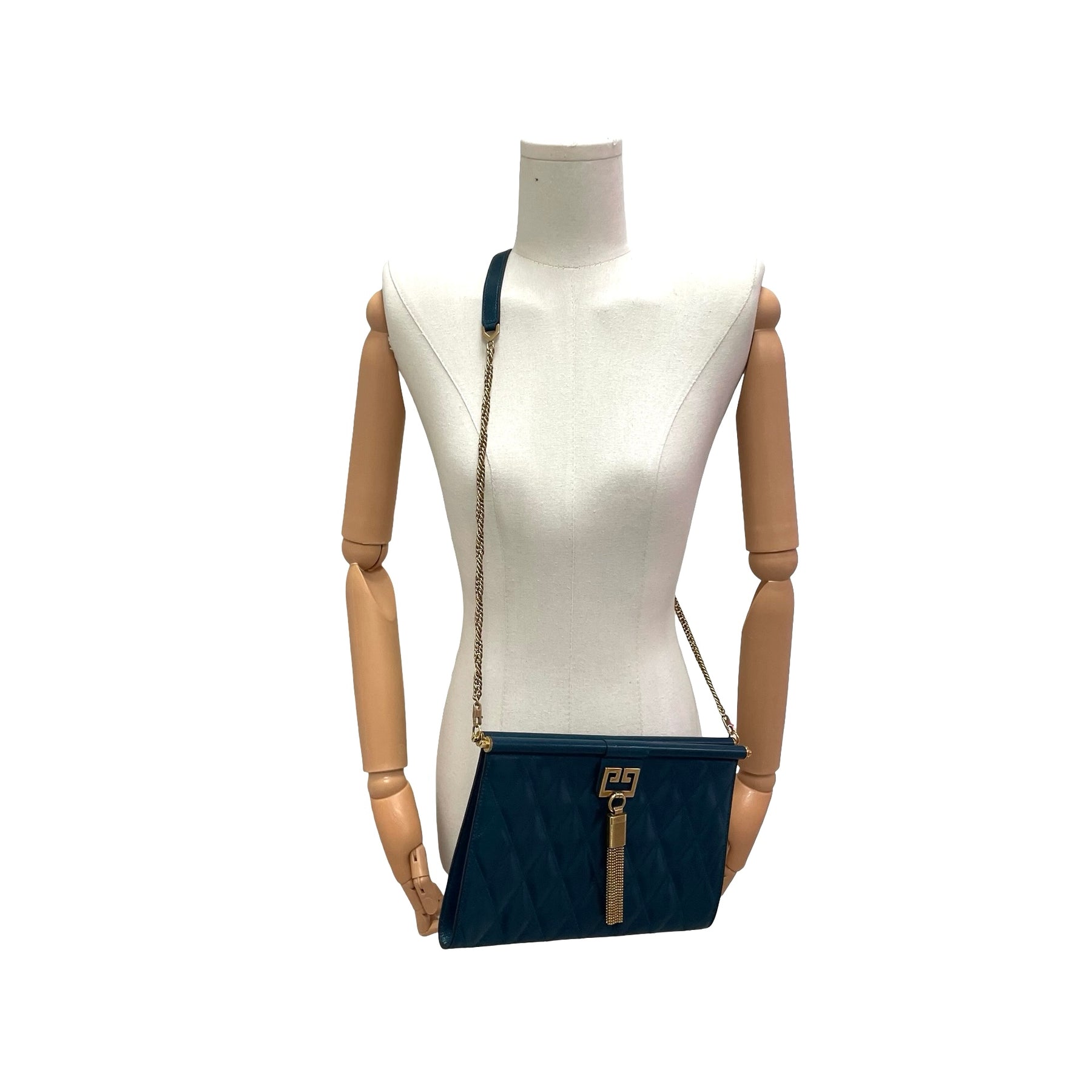 Clutch Givenchy, de piel color Peacock Blue con efecto capitonado, herrajes en dorado, placa al frente con tassel y cadena al hombro. Con uso, en buen estado.
