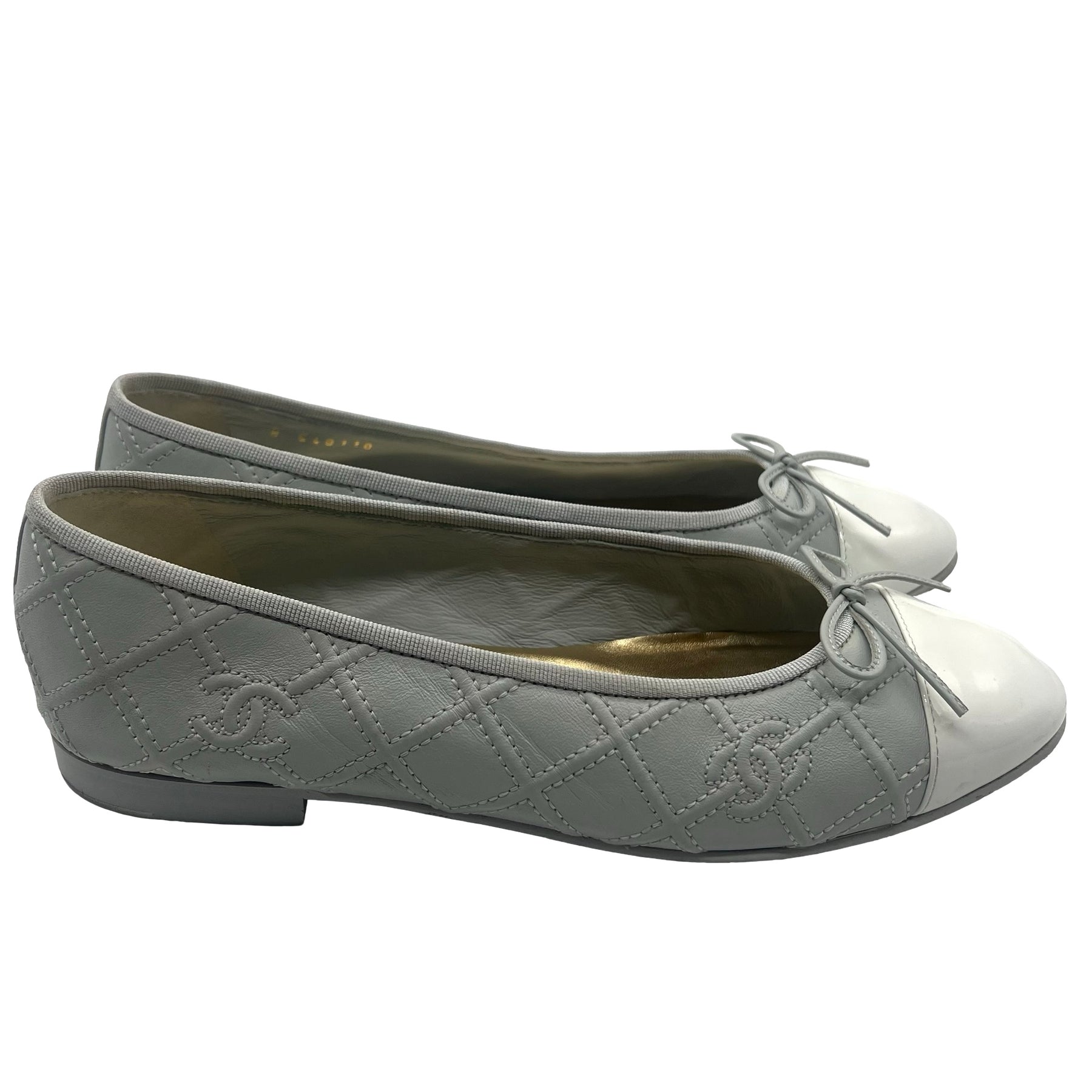 Flats Chanel, de piel color gris con CC y costuras, punta blanca con lazo en la parte de enfrente. Con uso, en buen estado.