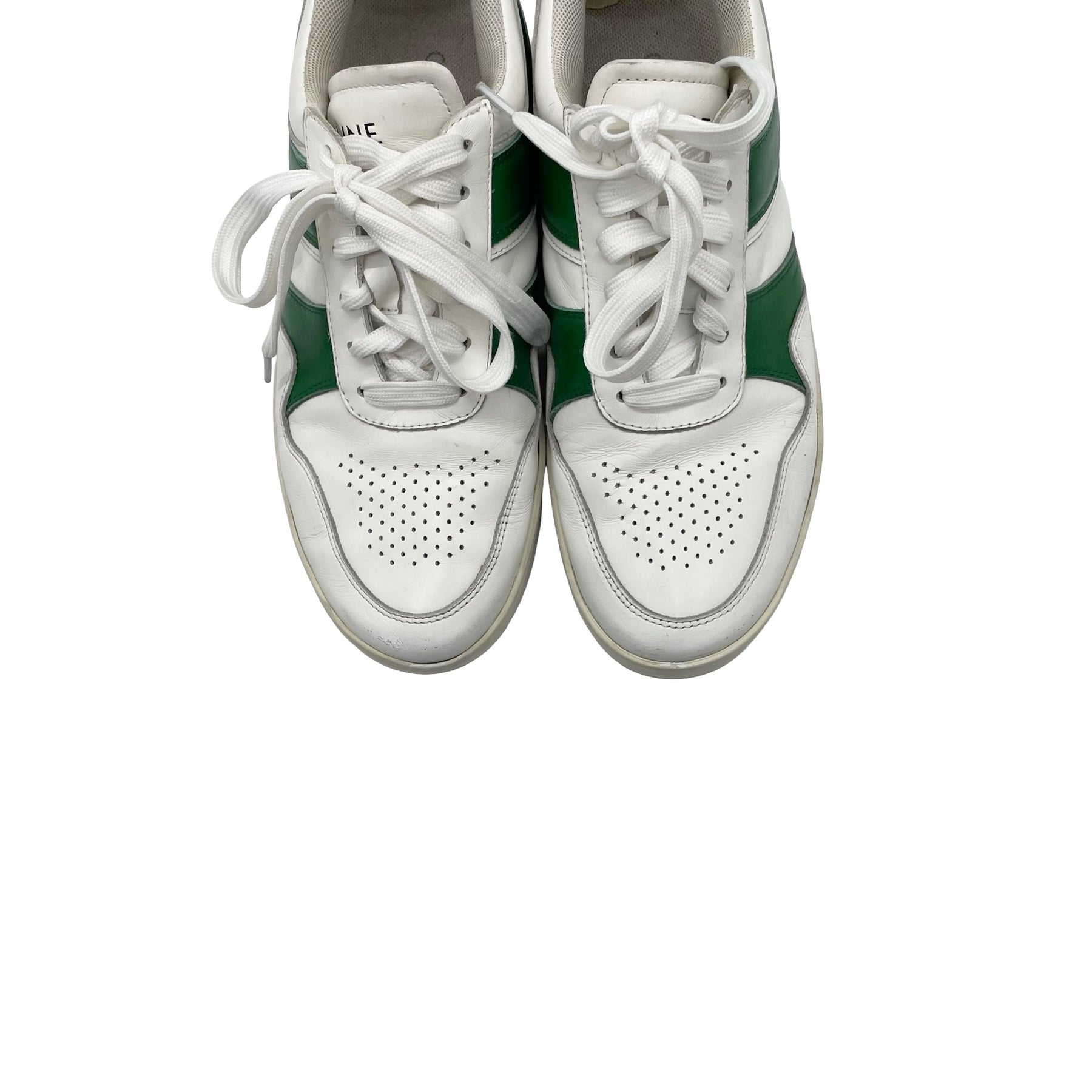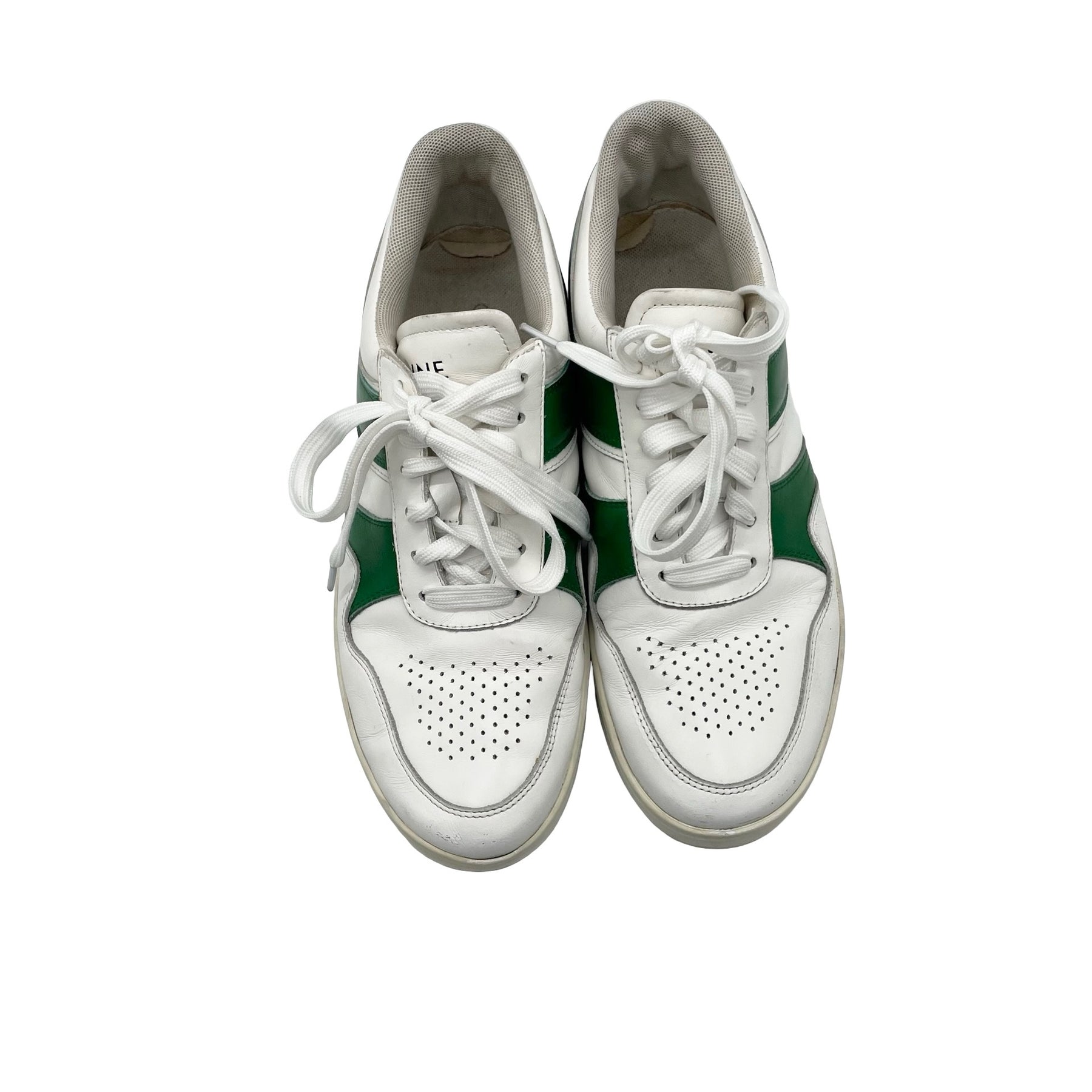 Tenis Celine Baja, de piel color blanco con franjas laterales en color verde. Con ligero desgaste al frente. Con uso, en buen estado.