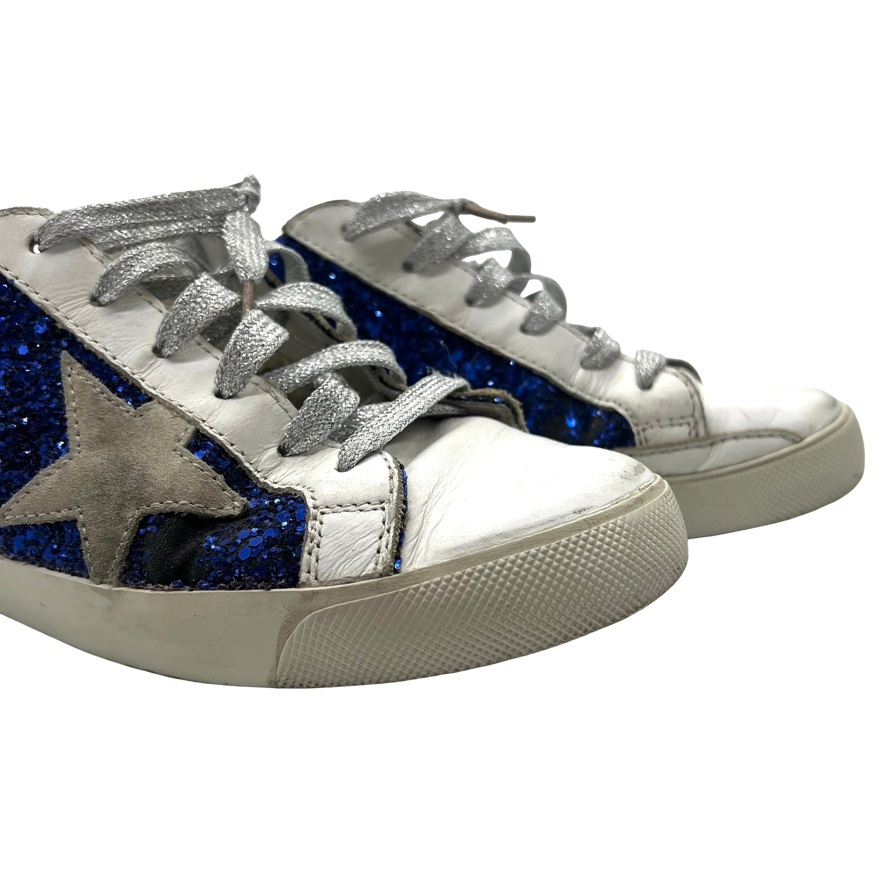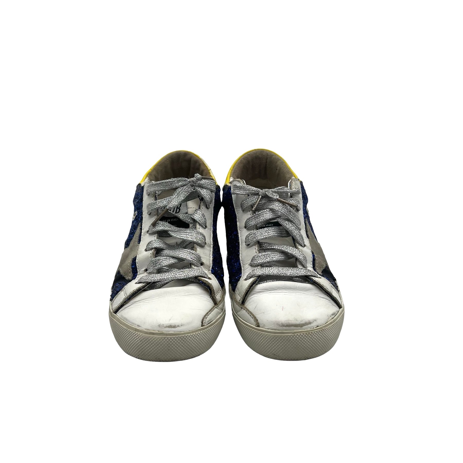 Tenis Golden Goose, de lentejuela azul y piel con detalles color amarillo y estrella en el lateral. Con desgaste de uso en lentejuela, en buen estado.