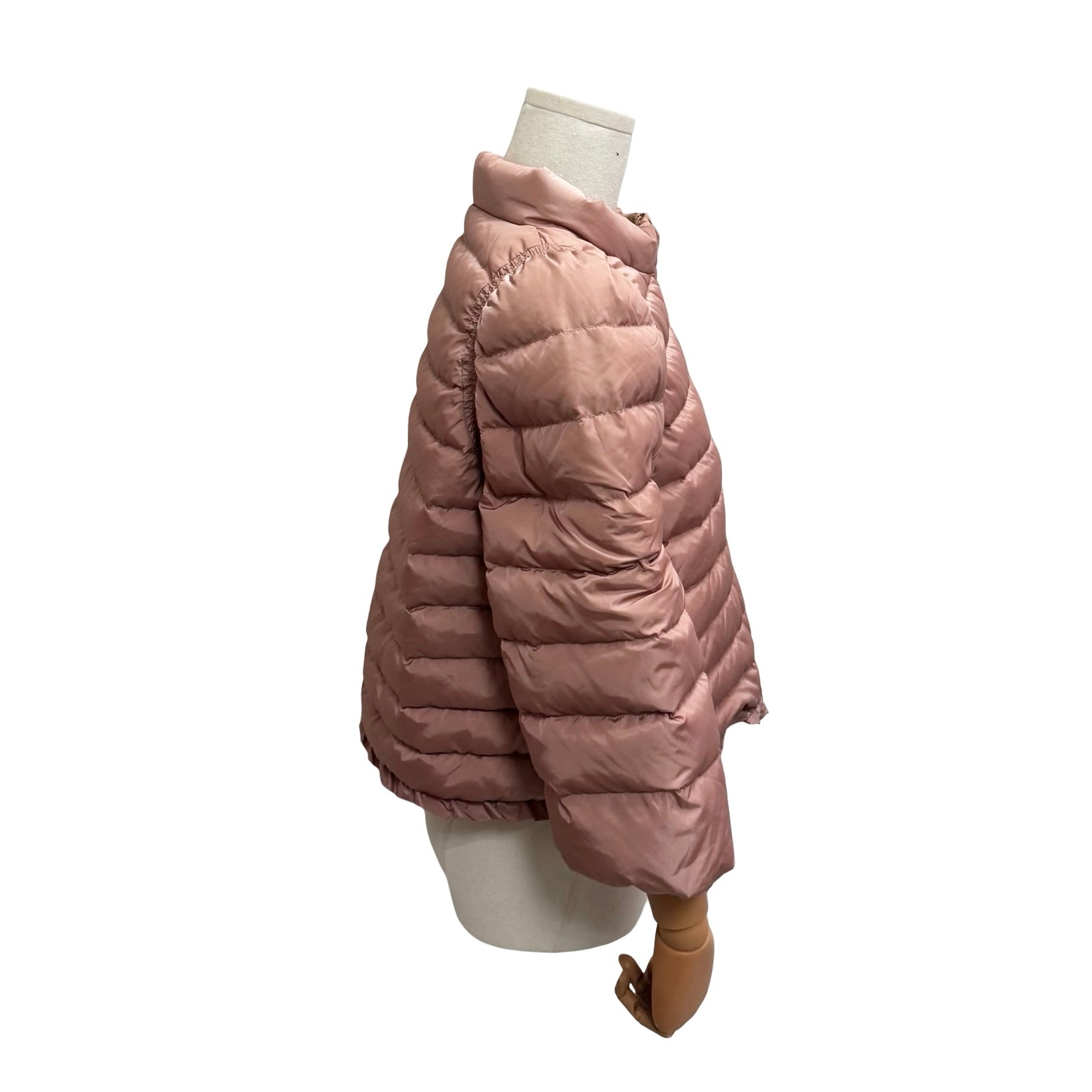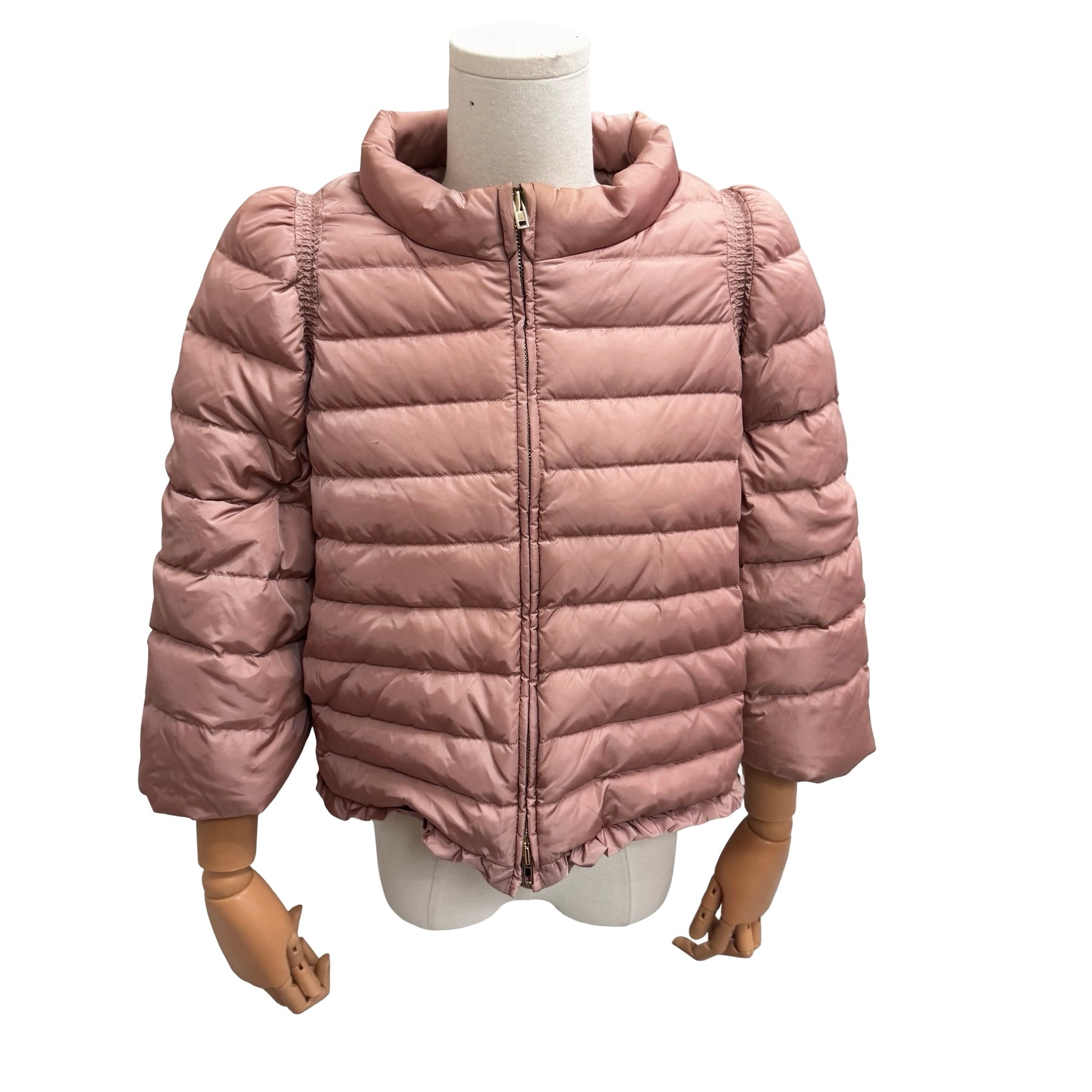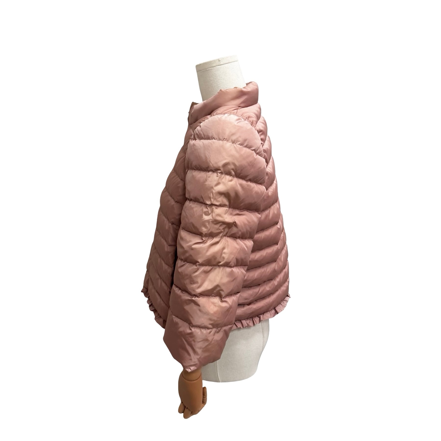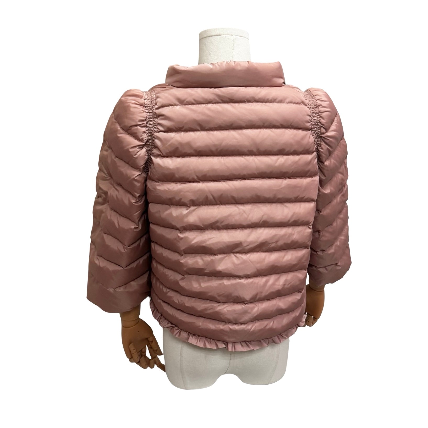 Chamarra Miu Miu, de tela pongé color rosa, con detalle de olanes en parte inferior y cierre al frente. Con pequeña mancha en tela. Con uso, en buen estado.