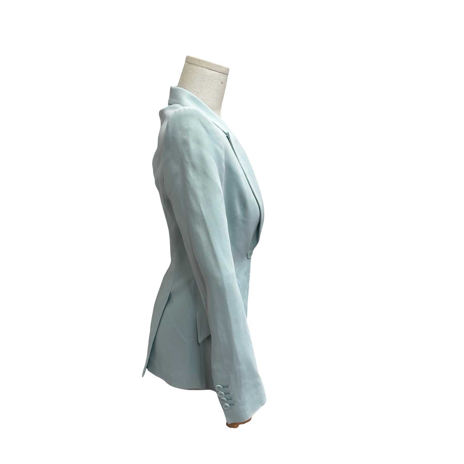 Saco Alexander McQueen, de lana en color menta con solapas al frente, dos bosillos laterales y botón al frente de cierre. Con uso, en buen estado.