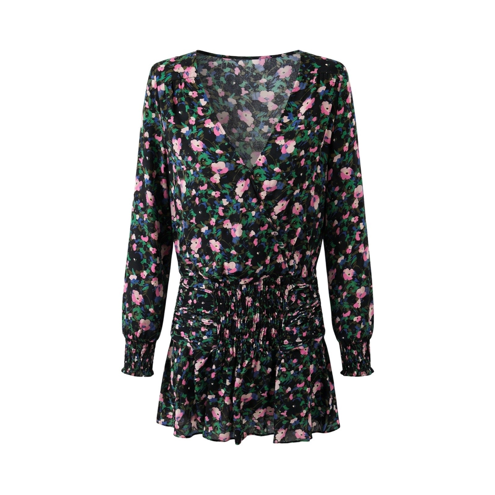 Vestido Veronica Beard, en mezcla de seda en color negro con estampado floral verde y rosa, botones al frente y cierre en lateral. Con uso, en buen estado.