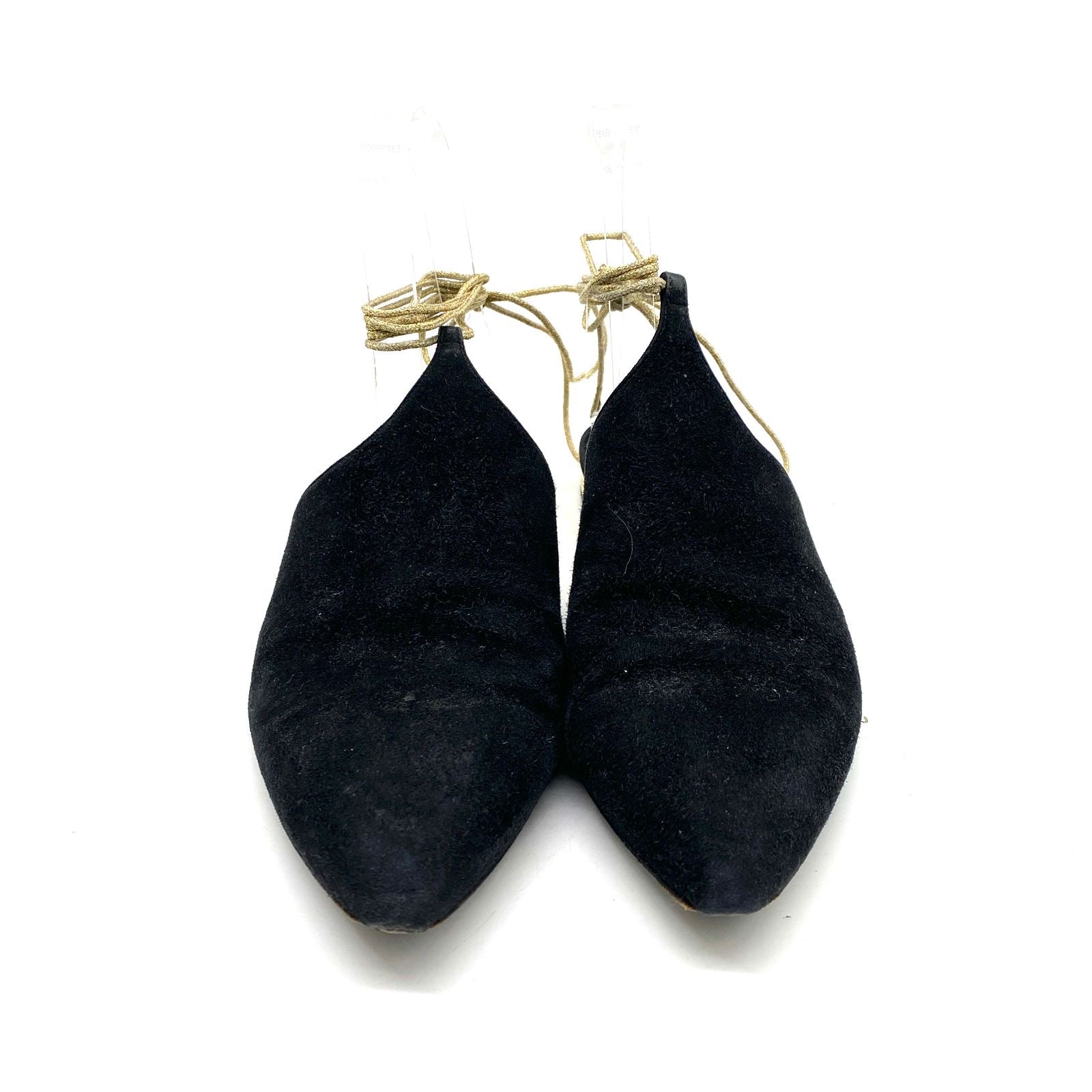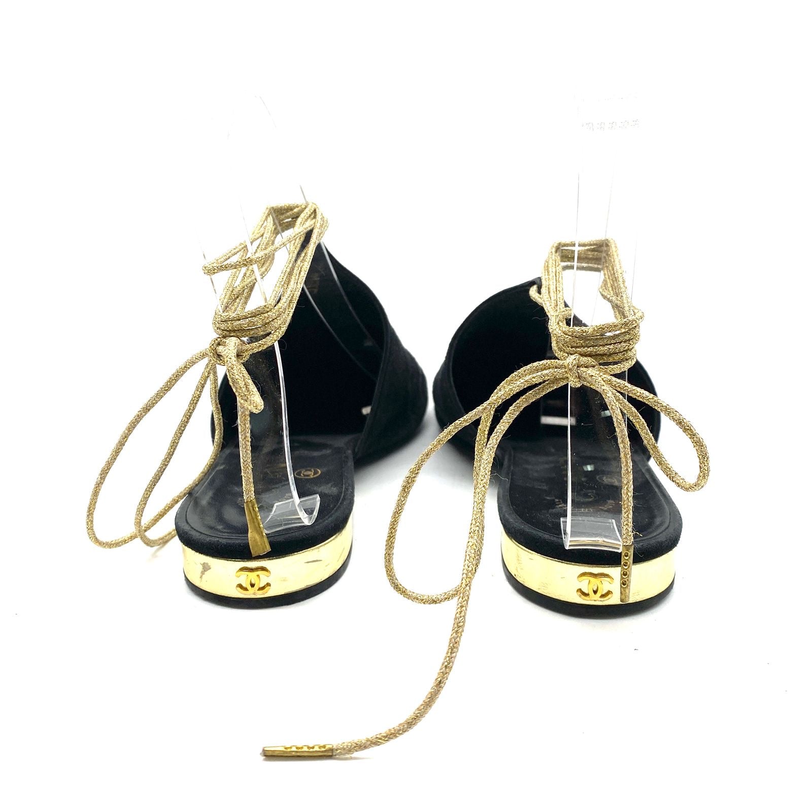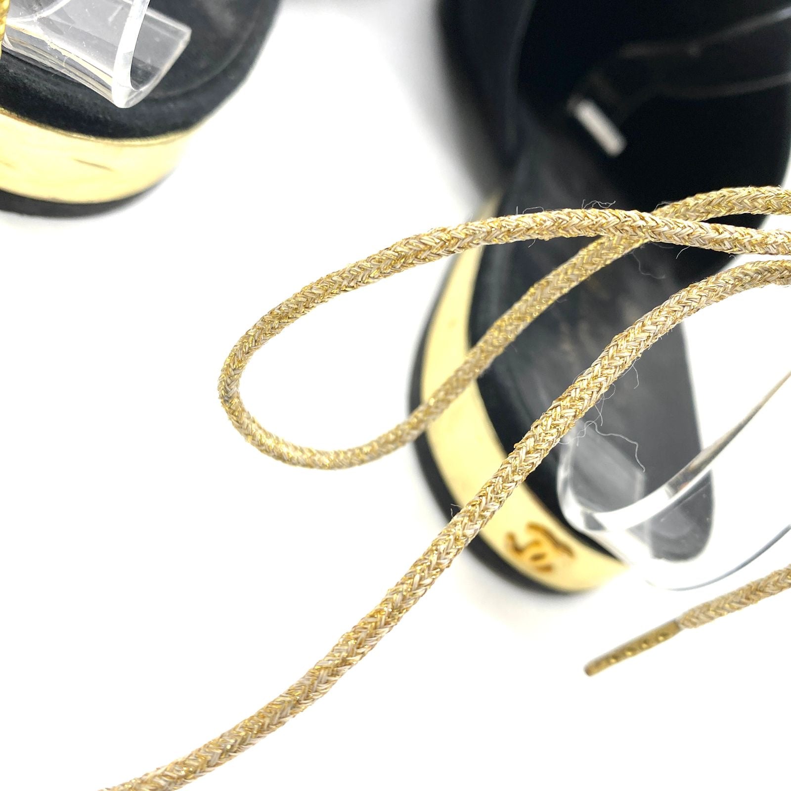Flats Chanel, de ante color negro y cordón dorado. Con uso, en buen estado.