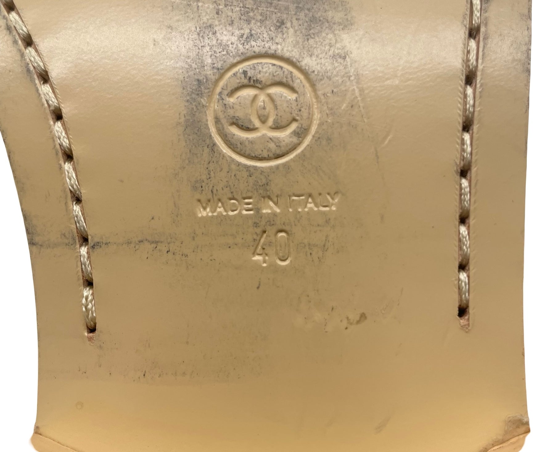 Loafers Chanel, de charol color nude, con logo plateado en la parte trasera. Con desgaste de uso, en buen estado.