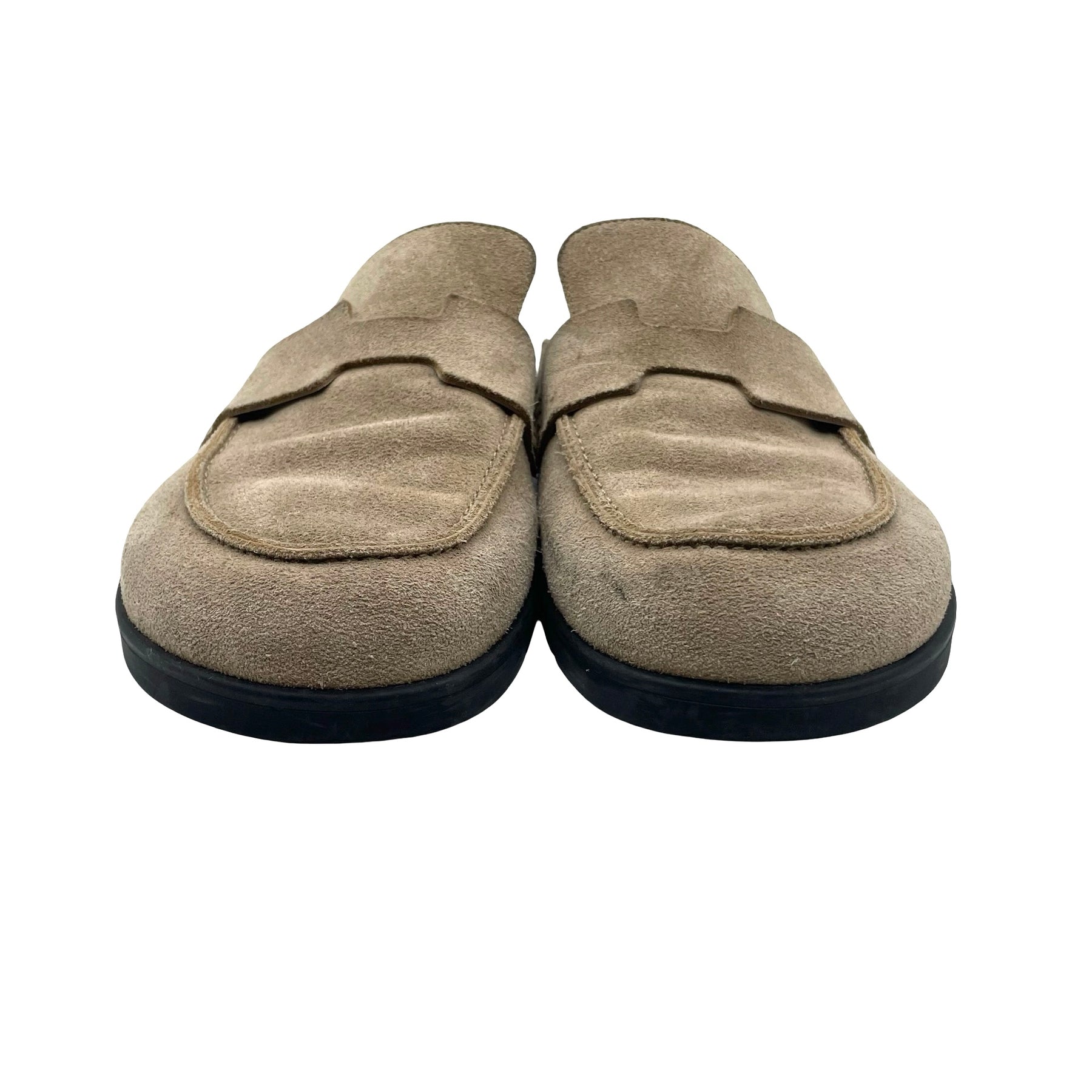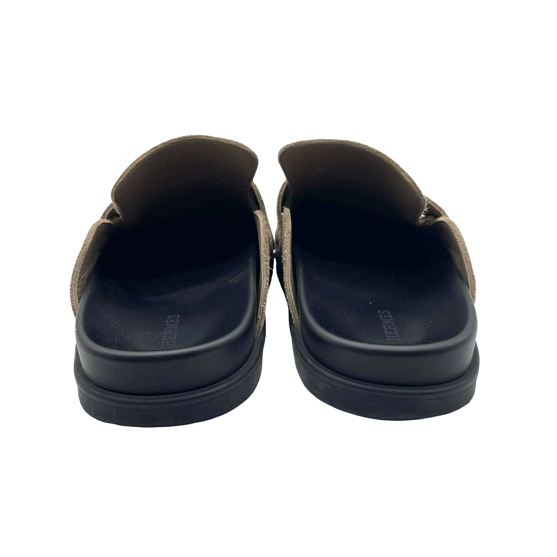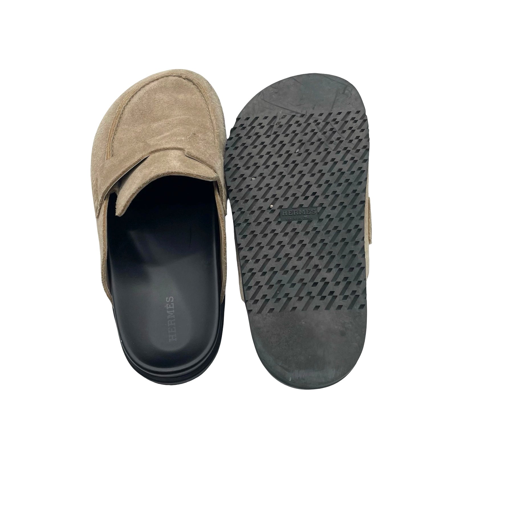 Mules Hermès Go, de terciopelo de ternera en color Beige Camel, con H calada en empeine. Con ligero desgaste al frente. Con uso, en buen estado.