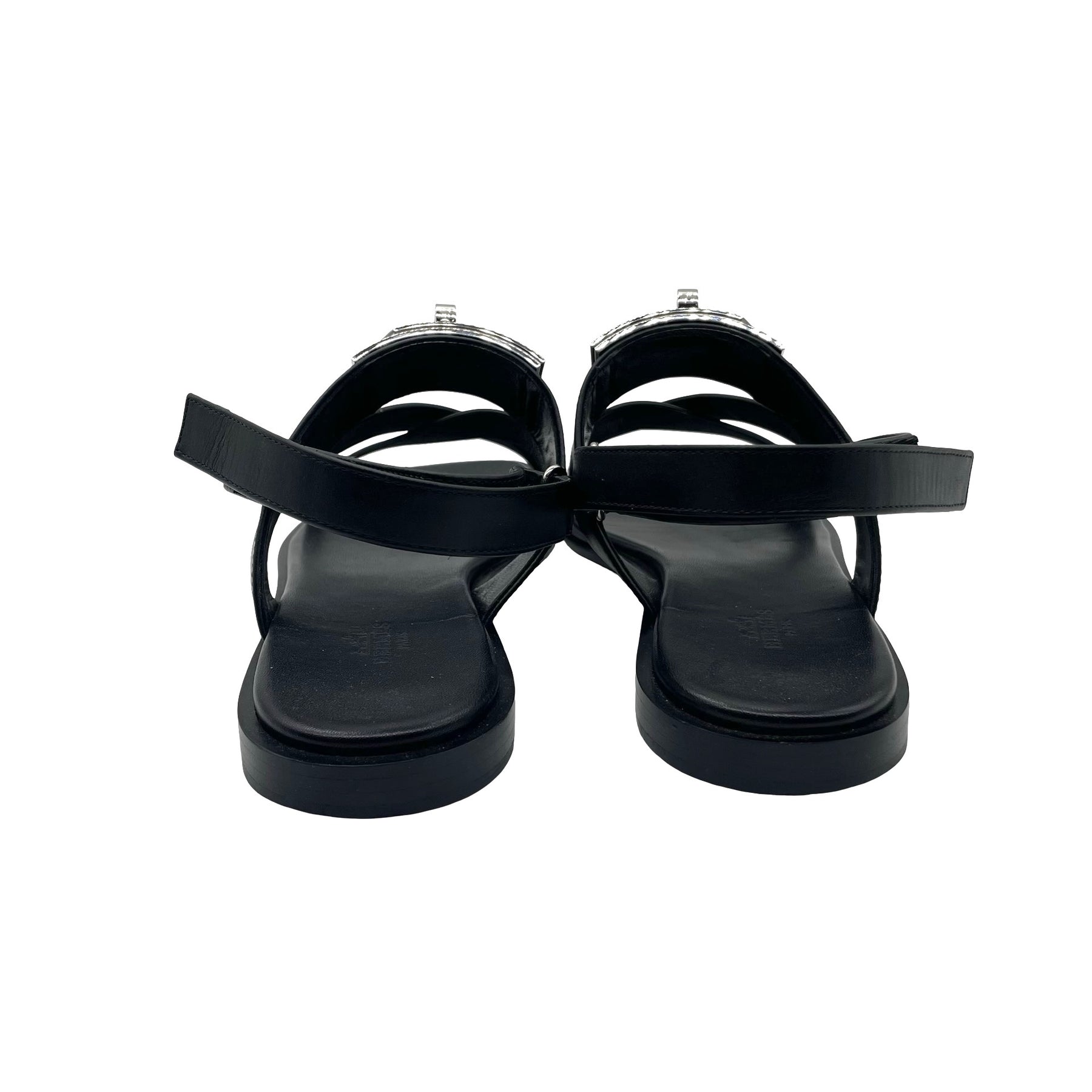 Sandalias Hermès Ines, de piel color negro con juego de tiras adornadas con una hebilla Kelly en palladium (PHW). Con uso, en buen estado.