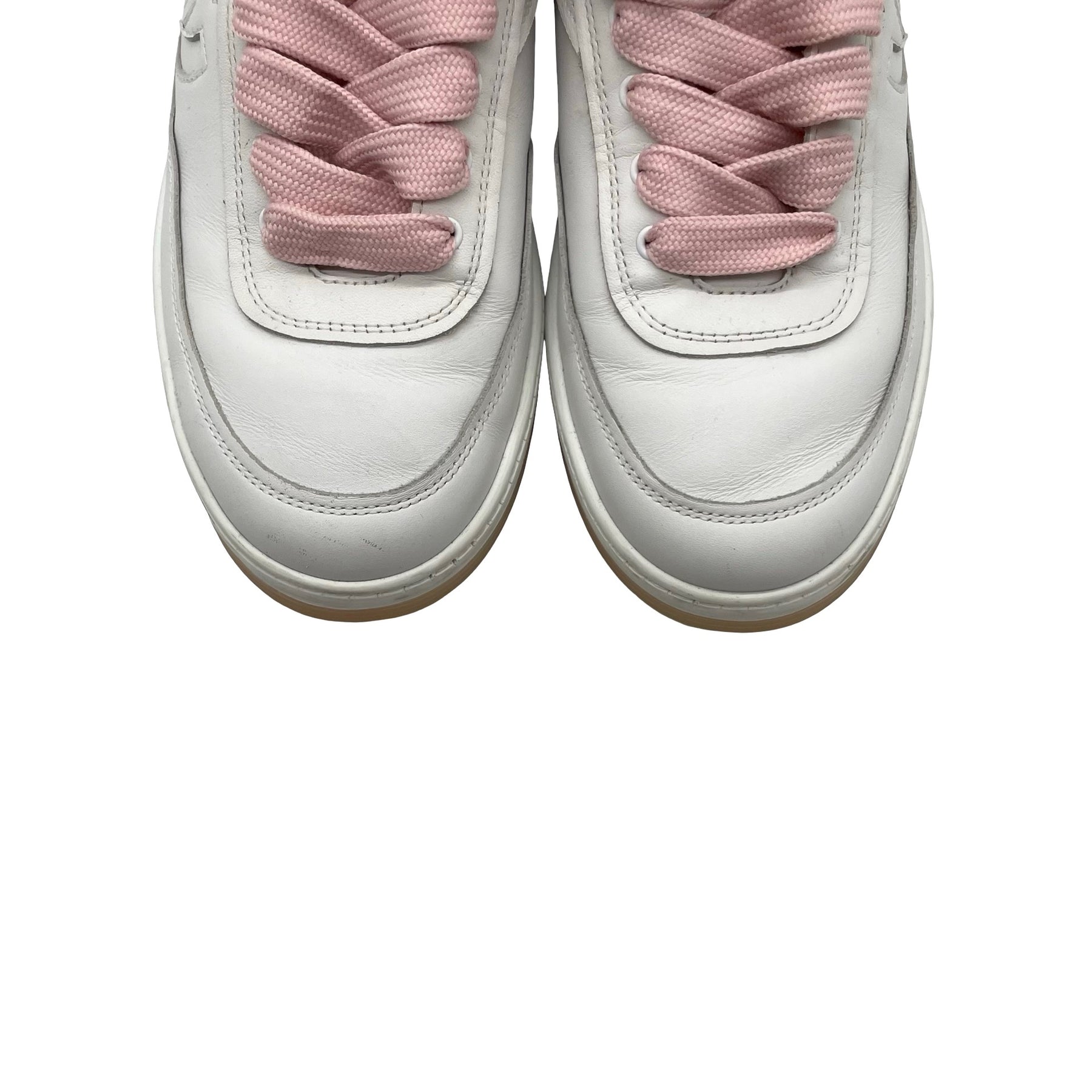 Tenis Chanel, de piel color blanco con logotipo CC en laterales y agujetas color rosa pastel. Con ligero desgaste en punta. Con uso, en buen estado.