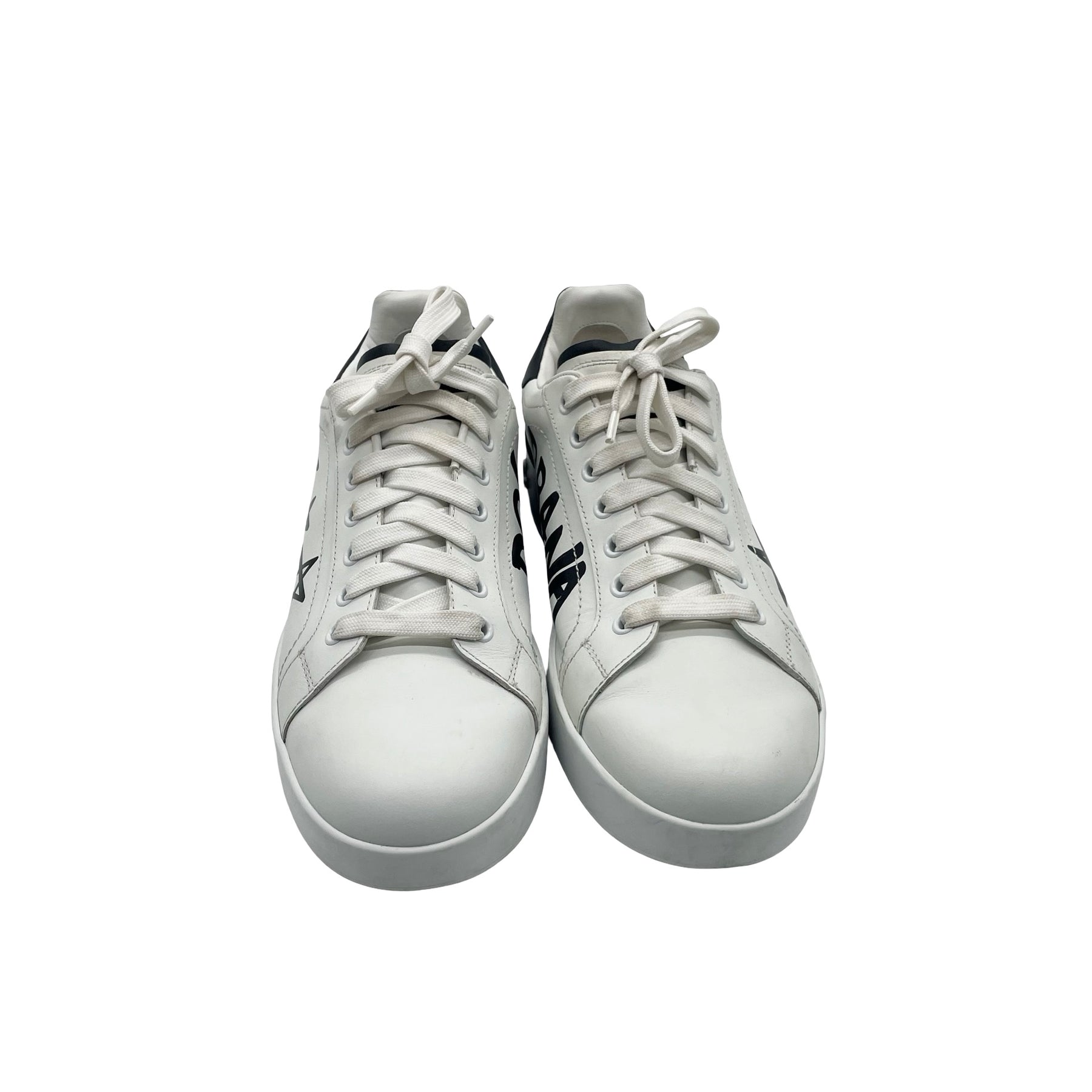 Tenis Dolce & Gabbana Portofino, de piel color blanco, con graffiti de estrellas en color negro y suela con logotipo en la parte trasera. Con uso, en buen estado.