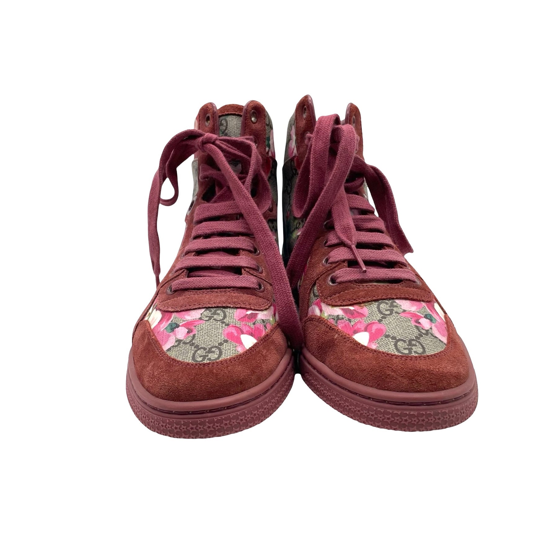Tenis Gucci High Top, de piel en canvas GG color café con print Dry Rose. Con uso, en buen estado.